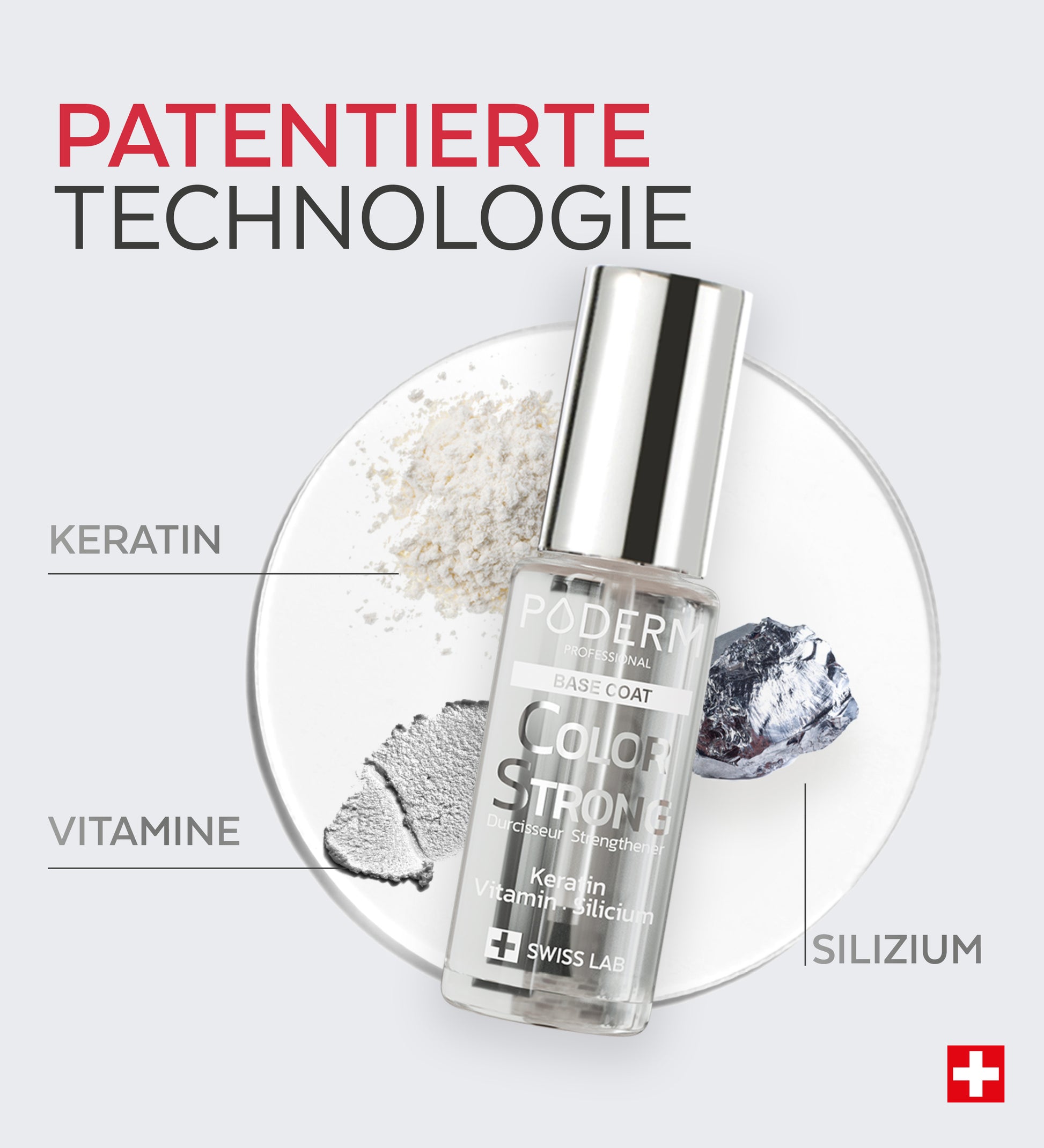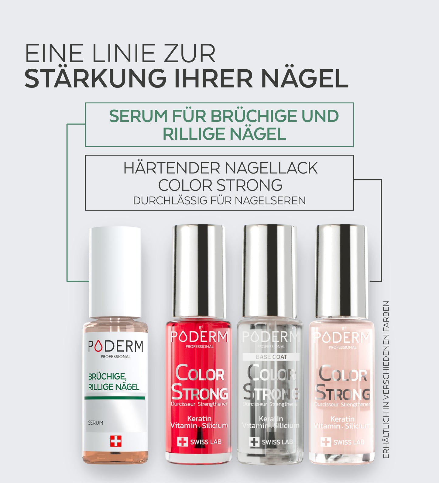 PODERM® Color Strong Pflegelacke stärken brüchige, weiche, geriffelte Nägel oder solche, die zum Brechen oder Splittern neigen.