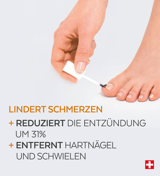Als reguliertes Medizinprodukt trägt es das CE-Zeichen. Lassen Sie sich von Ihrem Podologen oder Apotheker beraten und lesen Sie die Packungsbeilage vor Gebrauch sorgfältig durch. Swiss Footcare Laboratories. 10/2024