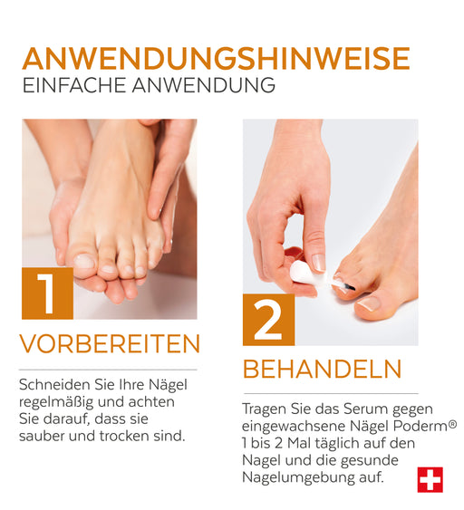 Das PODERM® Serum für eingewachsene Nägel schützt, entlastet und macht den Nagel und die umliegende Haut geschmeidig. Bereits nach der ersten Anwendung hilft es, Feuchtigkeitsverlust zu verhindern, das Aussehen der Nägel zu verbessern und das Risiko eingewachsener Nägel zu verringern.