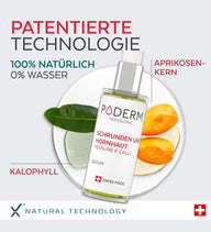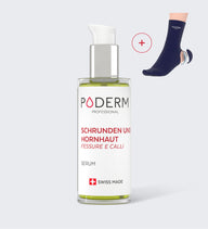 Die PODERM®Hautrisse und Hornhaut Plege wirkt, um Schrunden innerhalb von 7 Tagen zu reparieren und die Regeneration des Gewebes zu fördern. Sie besteht aus zwei Komponenten, die synergetisch wirken: 1 hochkonzentriertes Serum und 1 Paar Gelsocken.