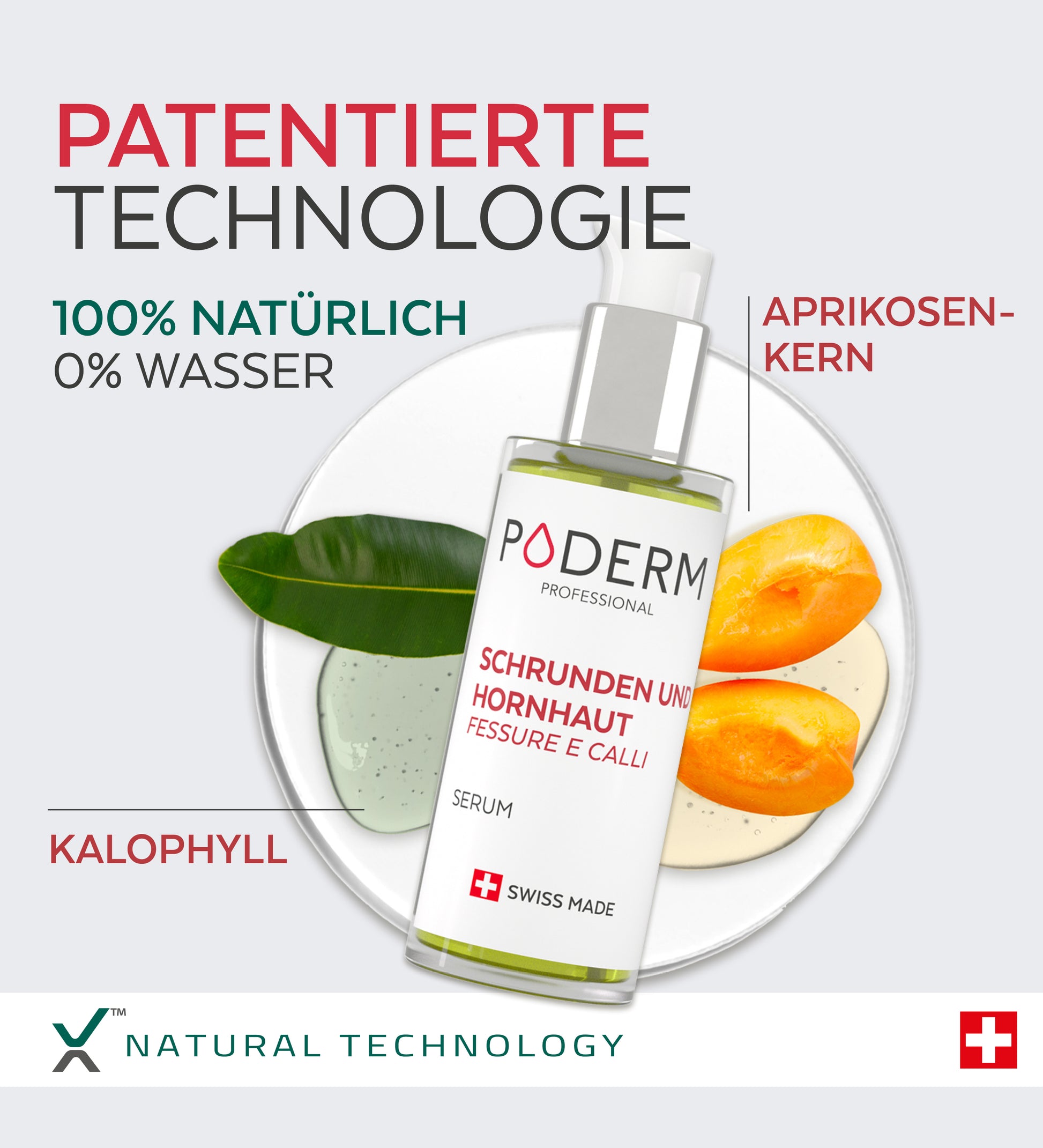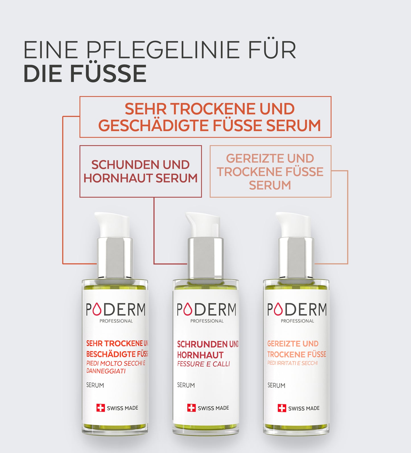Das Serum für Hautrisse und Hornhaut Plege ist Teil der PODERM®-Fußserumreihe, deren einzigartige Formulierung auf drei Säulen beruht: