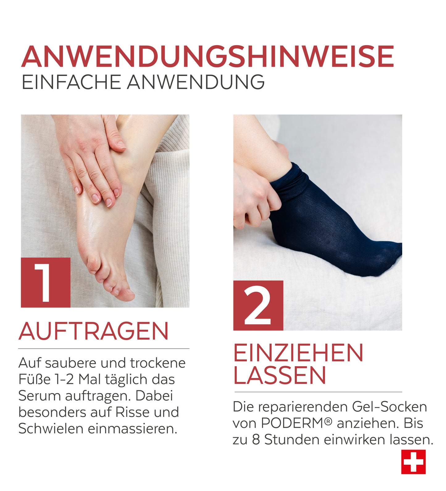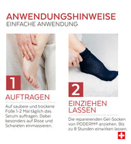 Zur äußeren Anwendung. Tragen Sie das Serum in ausreichender Menge 1-mal täglich abends vor dem Schlafengehen auf die Füße auf, besonders auf Risse und Schwielen, und ziehen Sie dann die PODERM® Repair Gel Socks an. Bis zu 8 Stunden einwirken lassen. Vorsichtsmaßnahmen: Mit den PODERM® Repair Gel Socks nicht laufen oder stehen, da die Gefahr von Stürzen und vorzeitiger Abnutzung besteht. Wiederverwendbare Socken, die mit lauwarmem Wasser und Seife gewaschen werden können. Vor Hitze geschützt aufbewahren. Außerhalb der Reichweite von Kindern aufbewahren. Nicht anwenden, wenn Sie gegen einen der Bestandteile allergisch sind. Nicht auf verletzte Haut auftragen. Nur zur topischen Anwendung. Nicht verschlucken. Kontakt mit den Augen vermeiden; bei Kontakt sofort mit Wasser spülen. Ab 12 Jahren - nicht bei Kindern, schwangeren oder stillenden Frauen anwenden.