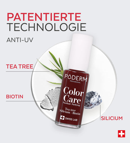 Color Care Lacke reinigen beschädigte Nägel, klären gelbe Nägel und fördern ein gesundes Nachwachsen. PODERM® Color Care Lacke sind atmungsaktiv, so dass PODERM® Nagelseren auch nach dem Auftragen in den Nagel eindringen können.