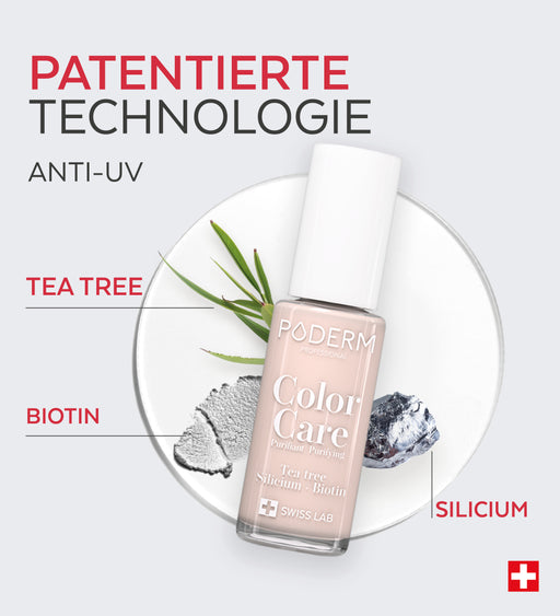 Color Care Lacke reinigen beschädigte Nägel, klären gelbe Nägel und fördern ein gesundes Nachwachsen. PODERM® Color Care Lacke sind atmungsaktiv, so dass PODERM® Nagelseren auch nach dem Auftragen in den Nagel eindringen können.