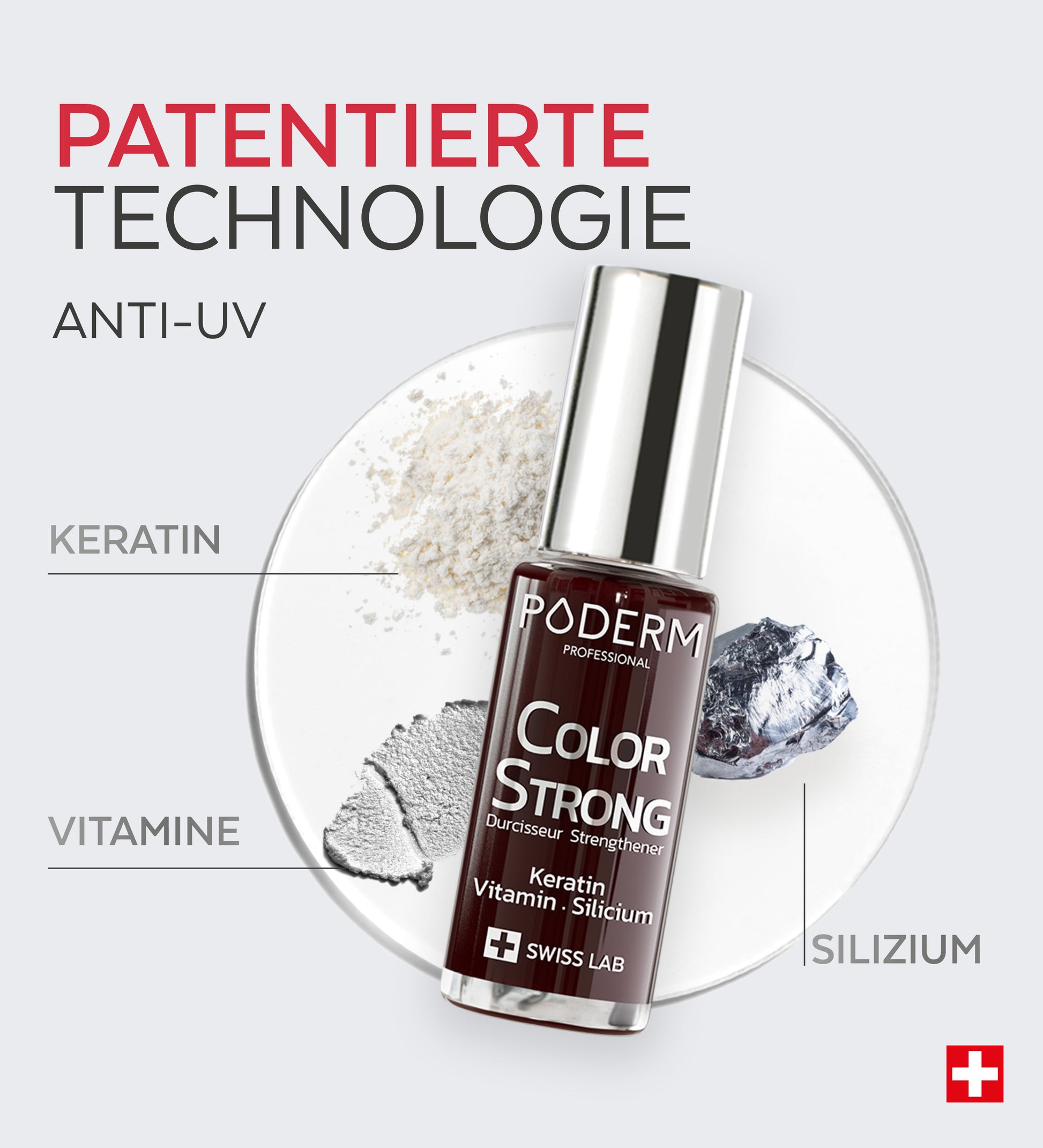 Silizium ist ein Spurenelement, das natürlicherweise in der Nagelstruktur vorkommt und die Keratinfasern zusammenhält. Keratin wiederum ist ein essentielles Protein, das etwa 90% der Nagelstruktur ausmacht und zu ihrer Festigkeit und Widerstandsfähigkeit beiträgt.