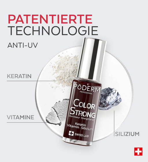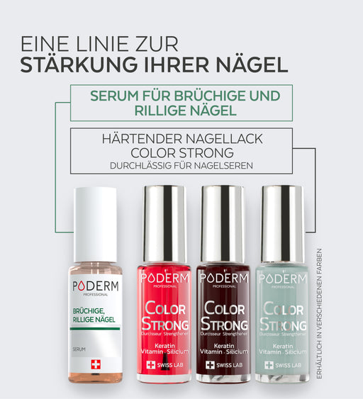 Die Nagellackserien Color Care und Color Strong sind für PODERM® Nagelseren durchlässig, so dass Sie Ihre Pflege fortsetzen können. Beide Produktreihen sind mit Biotin und Silizium angereichert, um ein gesundes und starkes Nachwachsen der Nägel zu fördern.
