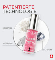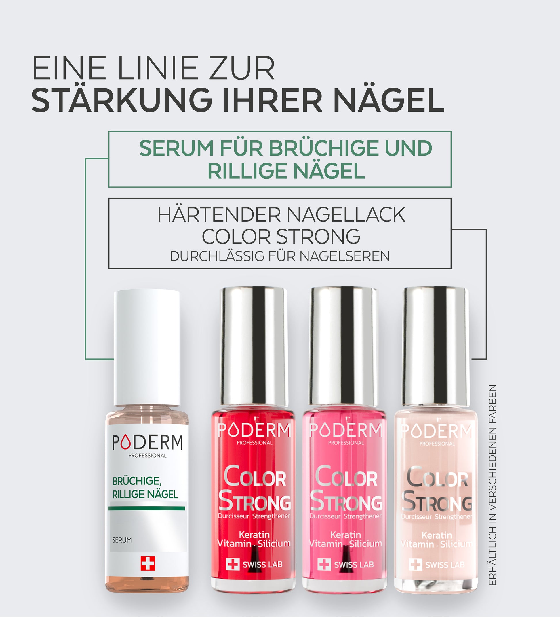 Die Nagellackserien Color Care und Color Strong sind für PODERM® Nagelseren durchlässig, so dass Sie Ihre Pflege fortsetzen können. Beide Produktreihen sind mit Biotin und Silizium angereichert, um ein gesundes und starkes Nachwachsen der Nägel zu fördern.