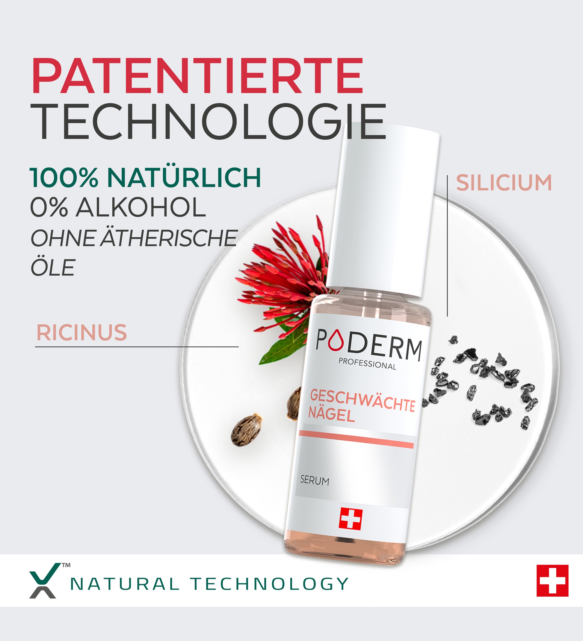 PODERM® Geschwächte Nägel Serum Silizium ist eine umfassende Pflege, die entwickelt wurde, um brüchige Nägel zu schützen und zu stärken. Es ist ideal, um Nagelverlust vorzubeugen, reduziert das Auftreten von Flecken (braun, schwarz, bläulich oder gelb) und korrigiert Unregelmäßigkeiten wie Rillen, Spliss und Bruch.