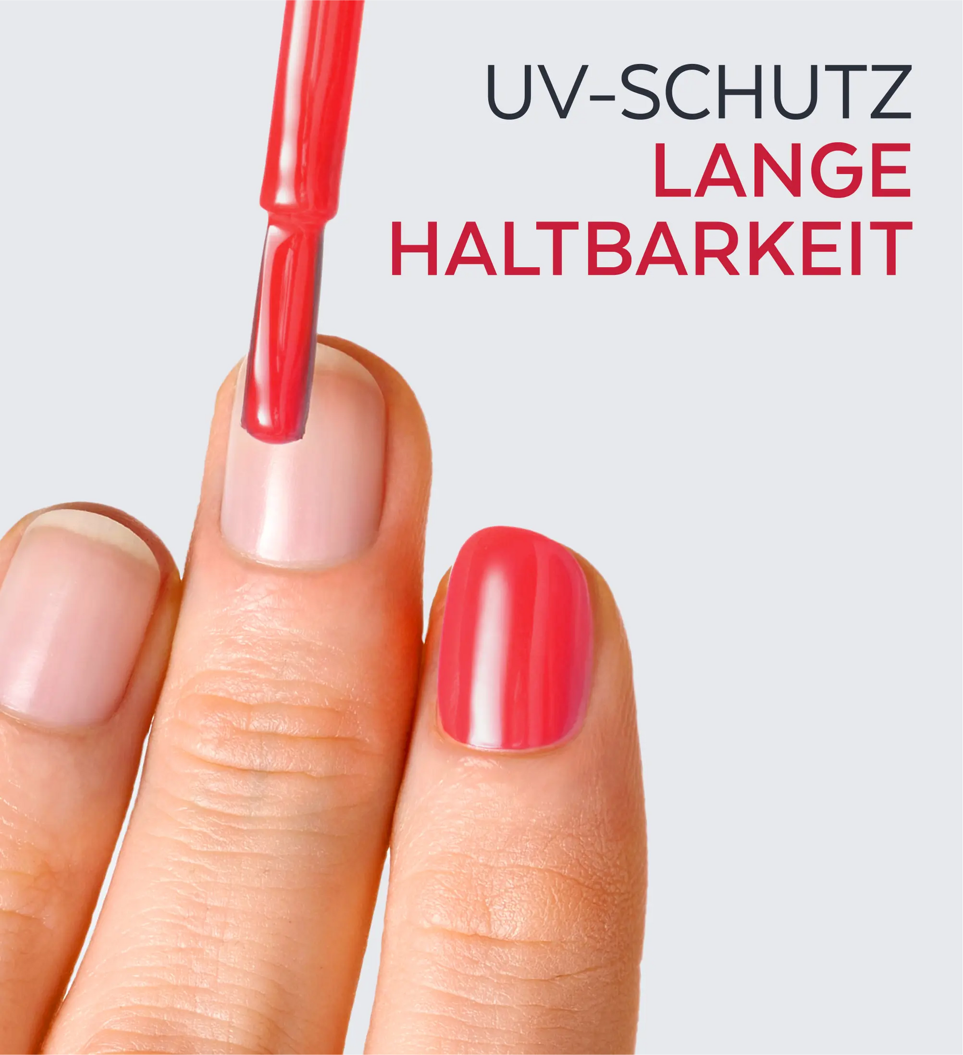 Die Lacke Color Care und Color Strong bieten UV-Schutz, um Ihre Nägel und die Haut unter den Nägeln vor Schäden durch Sonneneinstrahlung zu schützen (außer Top, Base, Gloss Vitality und Gloss Éclat).