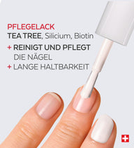 So können Sie das unschöne Aussehen des Nagels kaschieren, während Sie die Behandlung mit einem täglich aufgetragenen Serum fortsetzen. Ihre langanhaltende Formel ist mit Teebaum angereichert, der für seine reinigenden Eigenschaften bekannt ist, sowie mit Silizium und Biotin, die natürlich im Nagel vorkommen. Die Color Care Serie verschönert, reinigt und klärt Ihre Nägel.