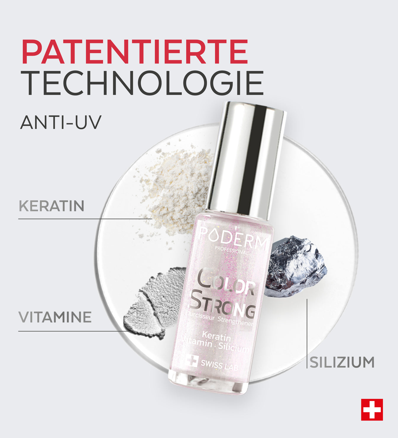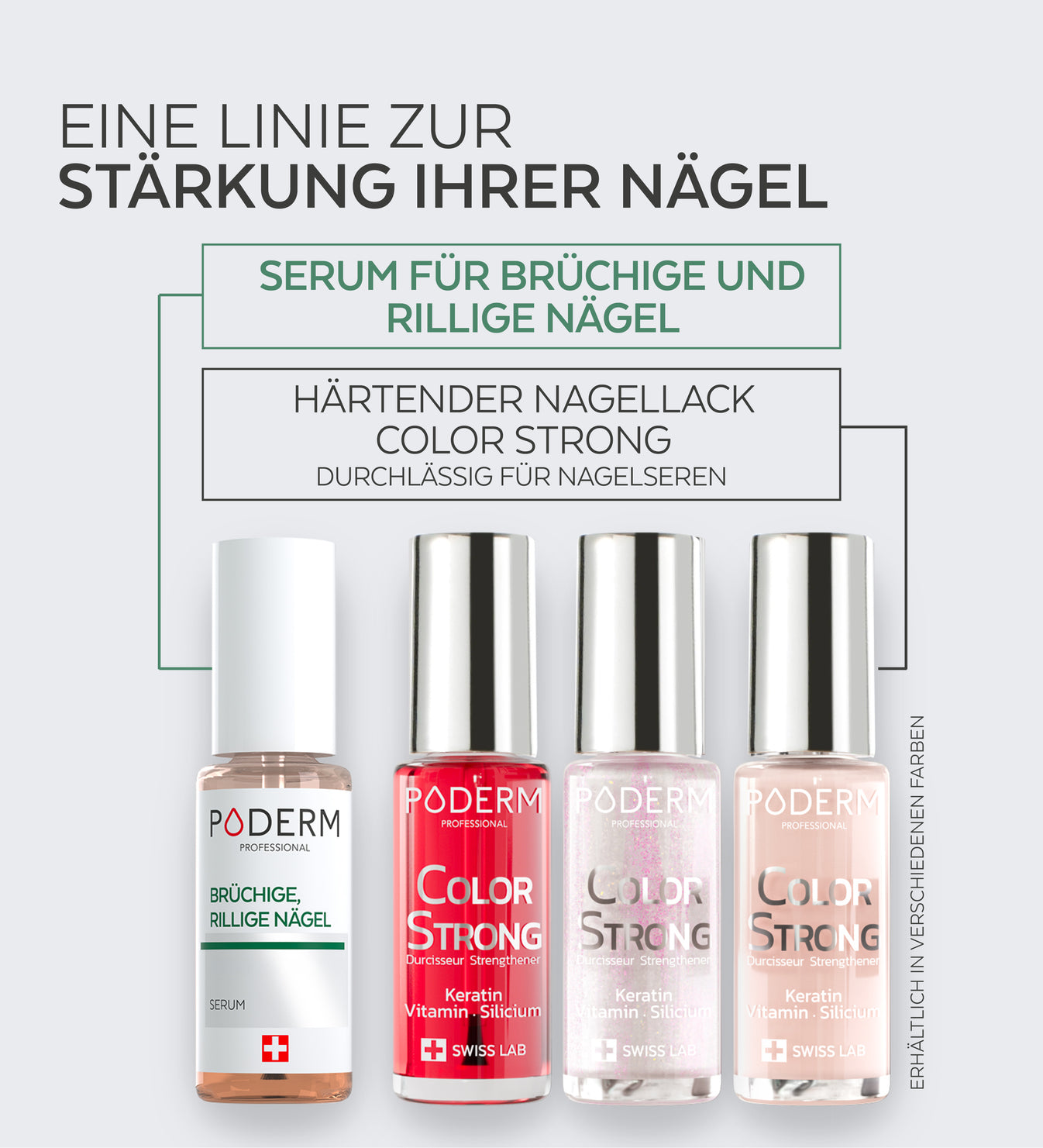 Die Nagellackserien Color Care und Color Strong sind für PODERM® Nagelseren durchlässig, so dass Sie Ihre Pflege fortsetzen können. Beide Produktreihen sind mit Biotin und Silizium angereichert, um ein gesundes und starkes Nachwachsen der Nägel zu fördern.