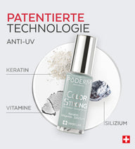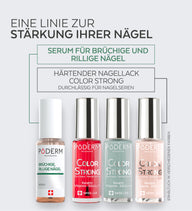 Die Nagellackserien Color Care und Color Strong sind für PODERM® Nagelseren durchlässig, so dass Sie Ihre Pflege fortsetzen können. Beide Produktreihen sind mit Biotin und Silizium angereichert, um ein gesundes und starkes Nachwachsen der Nägel zu fördern.