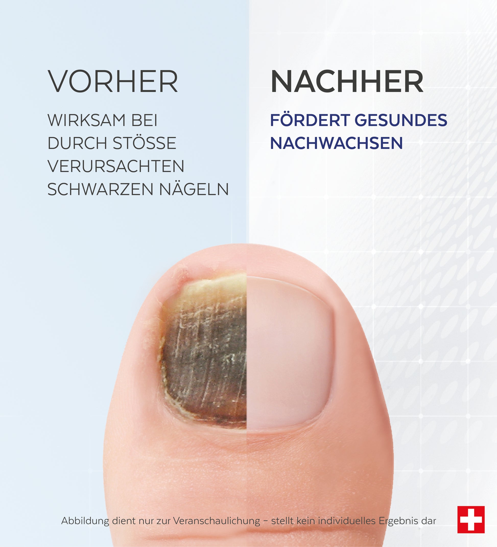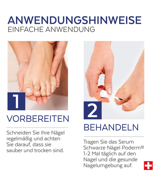 Unten finden Sie Fotos von Anwendungsbeispielen des PODERM® Black Nails Serum für Nägel, die durch natürliche Alterung oder das Tragen von geschlossenen Schuhen traumatisiert sind. Hierbei handelt es sich um schwarze oder blaue Nägel. Es wird empfohlen, diese Pflege bis zum Verschwinden des Hämatoms aufzutragen und sie vorbeugend zu verwenden, insbesondere bei Sportlern.