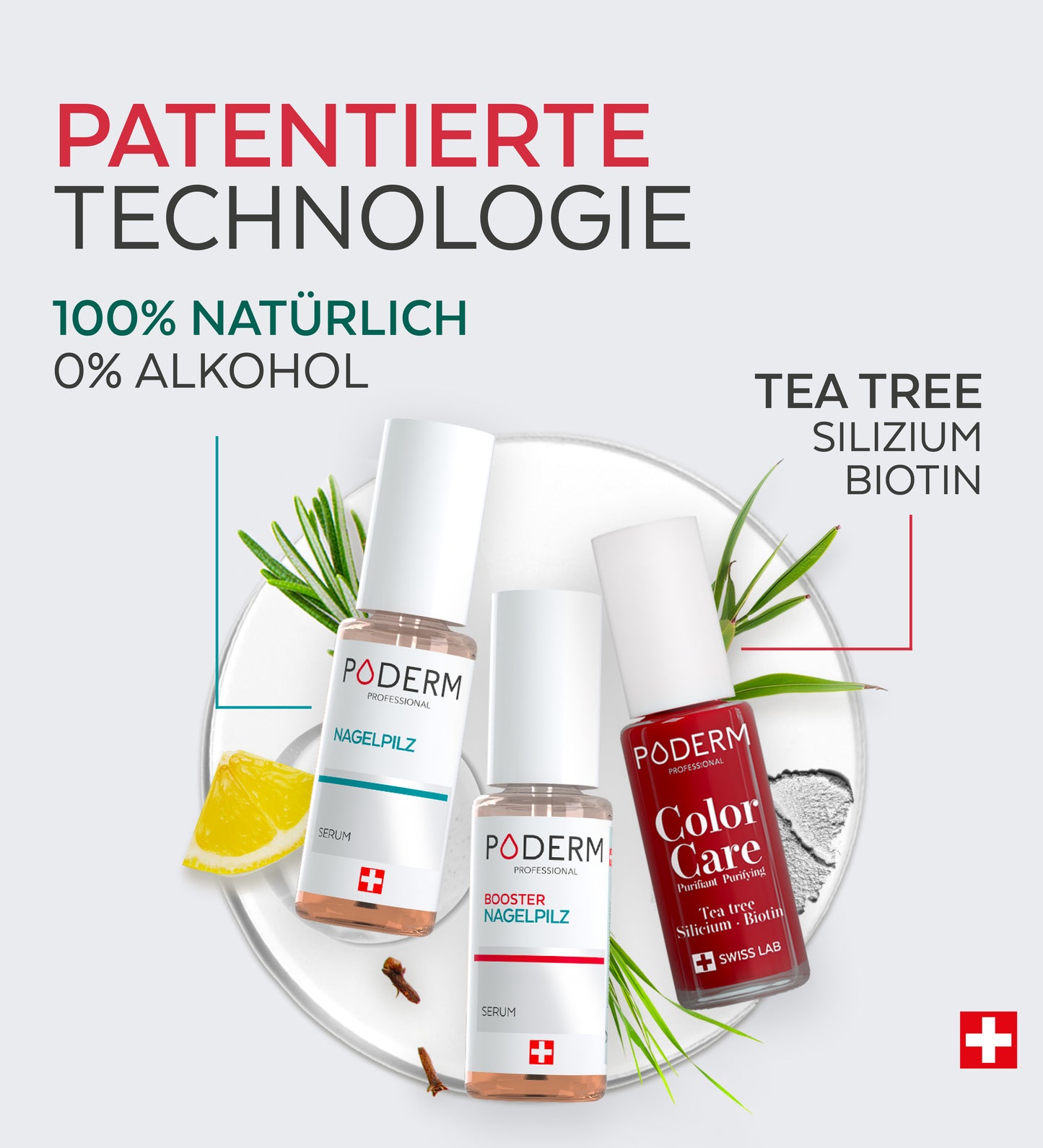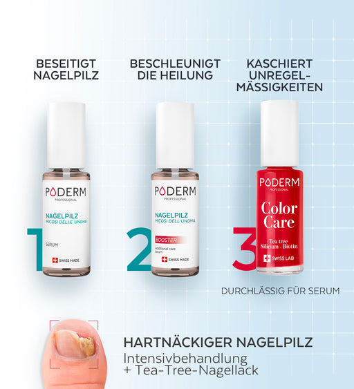 Das PODERM® Color Care Trio-Pack - Nagelpilz kombiniert drei wichtige Produkte für eine wirksame und ästhetische Behandlung von durch Nagelpilz geschädigten Nägeln. Dieses Trio besteht aus dem Nagelpilz-Serum zur Behandlung, dem Booster-Serum zur Intensivierung der Behandlungswirkung und dem Color Care Lack zum Kaschieren und Pflegen von geschädigten Nägeln.