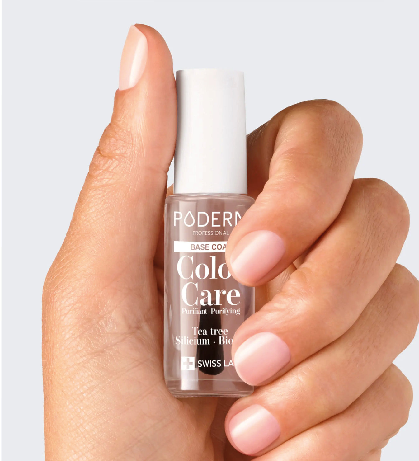 Application: Tragen Sie eine dünne Schicht PODERM® Base Coat auf jeden Nagel auf und lassen Sie sie vollständig trocknen.