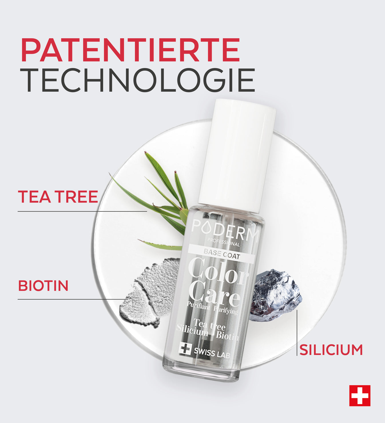 Der PODERM® Base Coat enthält natürliche Inhaltsstoffe wie Grüntee-Extrakt, Rizinusöl und andere stärkende Wirkstoffe. Bitte überprüfen Sie das Etikett des Produkts für eine vollständige Liste der Inhaltsstoffe.