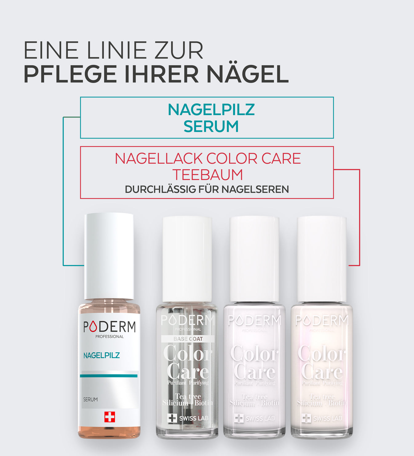 PODERM® Color Care Lacke sind atmungsaktiv: Sie sind durchlässig für PODERM® Nagelseren, um die Nägel zu verschönern und gleichzeitig die Pflege beschädigter Nägel fortzusetzen. Ihre langanhaltende Formel ist mit Teebaum angereichert, der für seine reinigenden Eigenschaften bekannt ist, sowie mit Silizium und Biotin, Spurenelementen bzw. Vitaminen, die natürlich im Nagel vorkommen. Die Color Care Linie verschönert, reinigt und klärt Ihre Nägel.