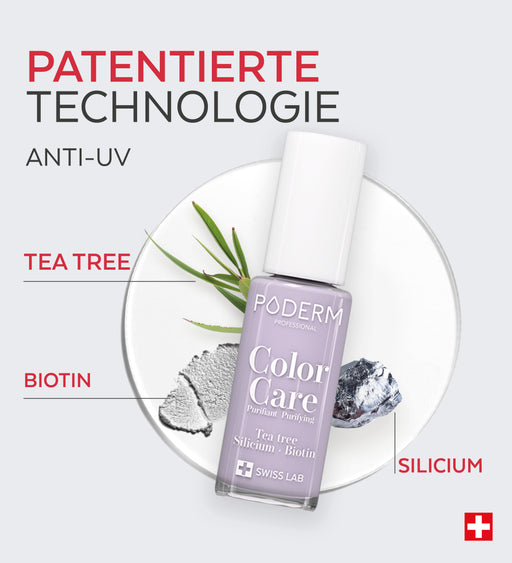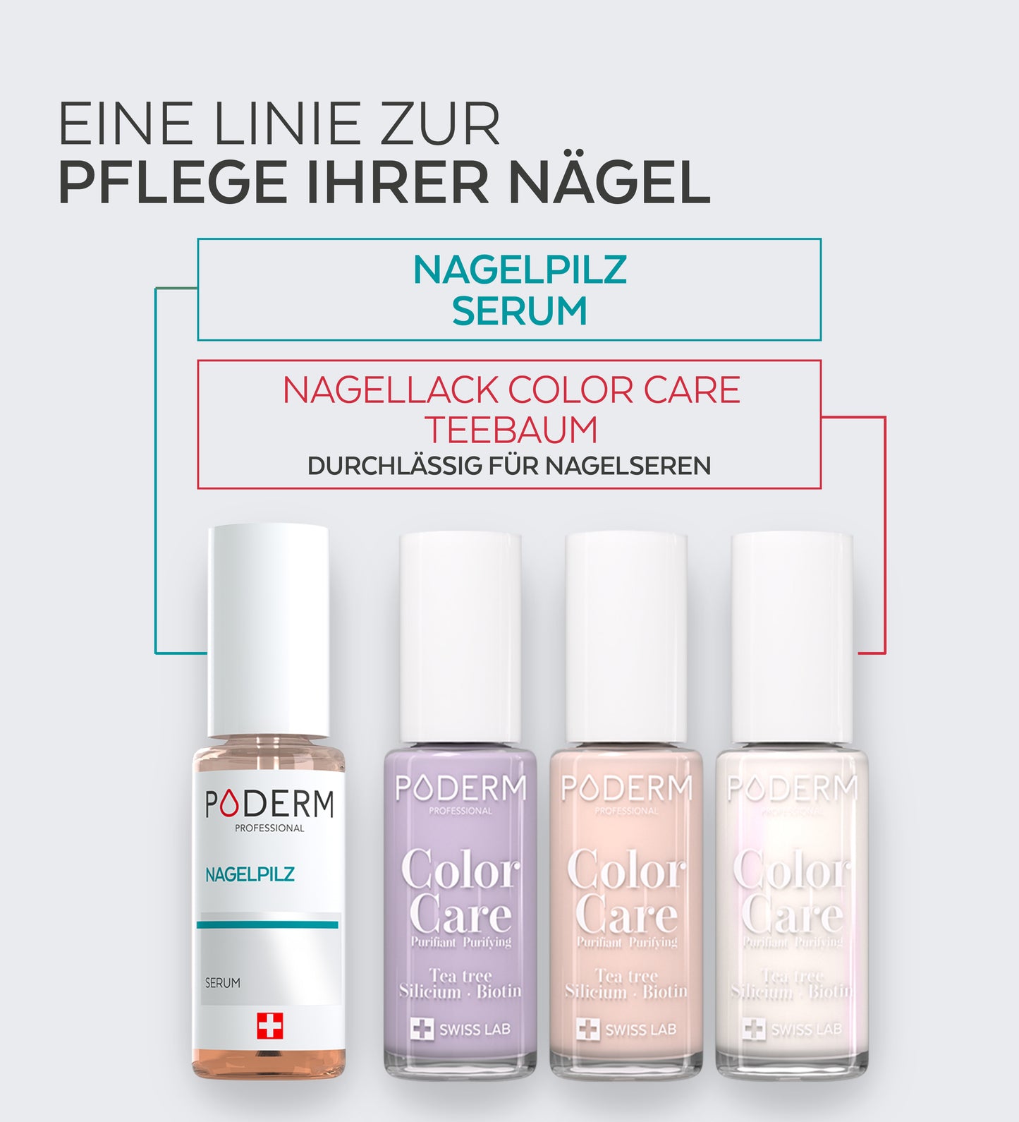 Color Care Lacke reinigen geschädigte Nägel, klären gelbe Nägel und fördern gesundes Nachwachsen. PODERM® Color Care Lacke sind atmungsaktiv, so dass PODERM® Nagelseren auch nach dem Auftragen in den Nagel eindringen können.