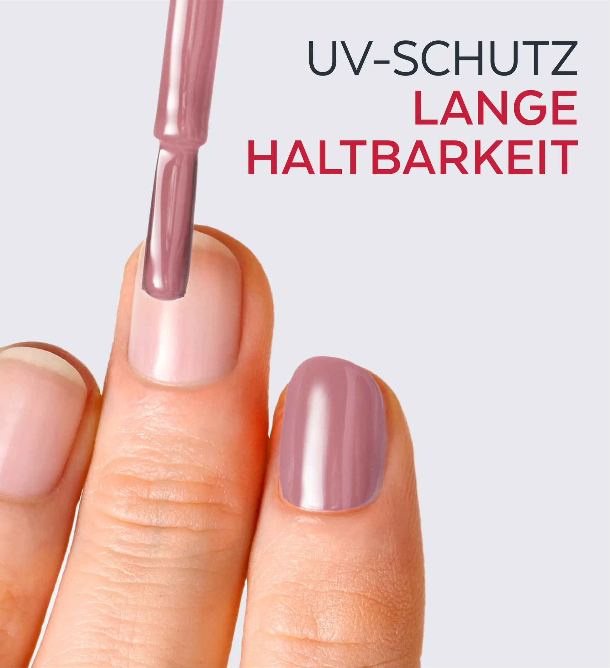 Die Lacke Color Care und Color Strong bieten UV-Schutz, um Ihre Nägel und die Haut unter den Nägeln vor Schäden durch Sonneneinstrahlung zu schützen (außer Top, Base, Gloss Vitality und Gloss Éclat).