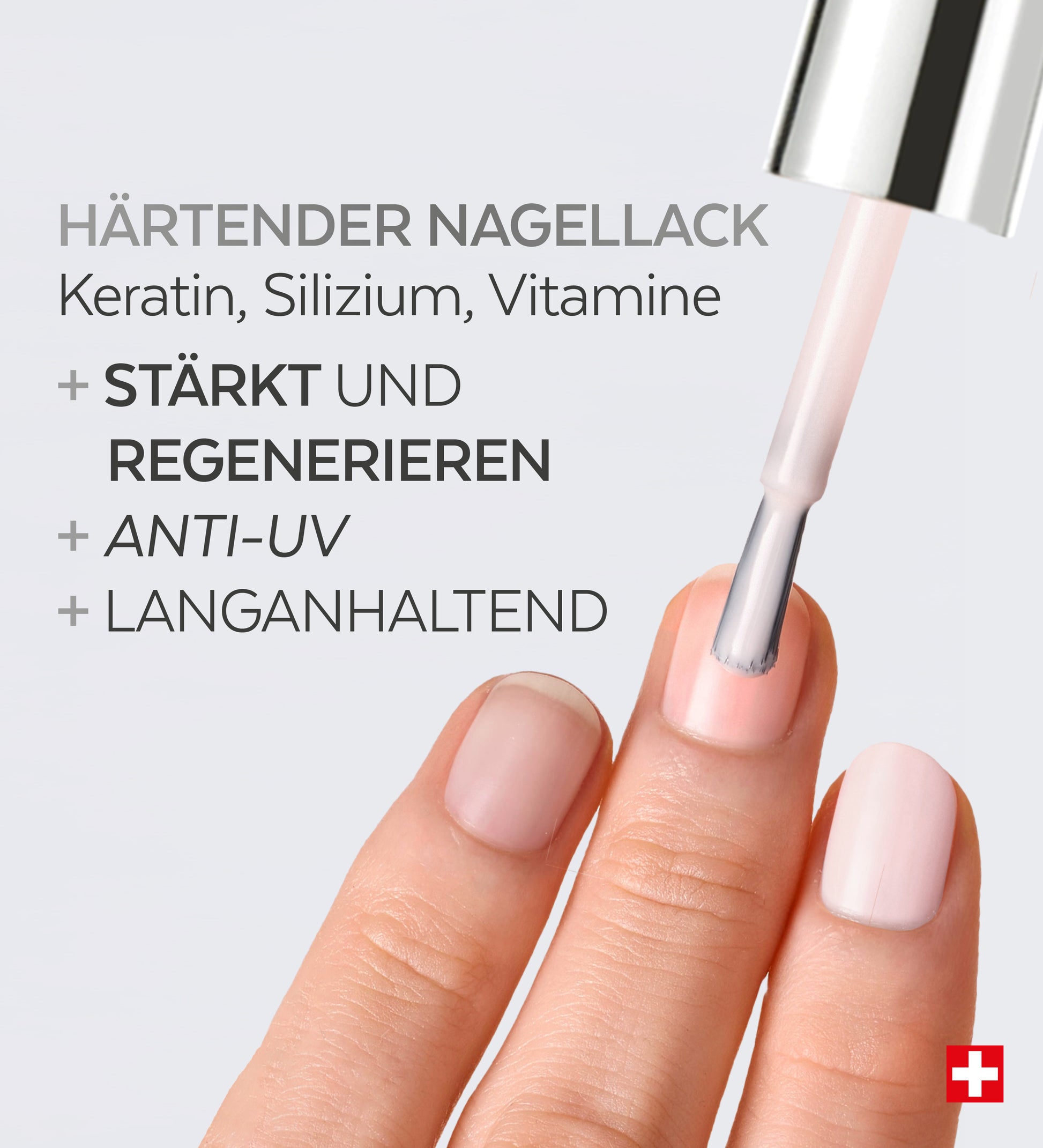 Durch die Förderung eines starken Nagelwachstums werden Ihre Nägel widerstandsfähiger gegen die täglichen Belastungen und wachsen gesünder und schneller. Das wiederholte Auftragen von semipermanentem Lack oder Gel sowie der Kontakt mit Chemikalien können die Nageloberfläche verändern und sie brüchig machen. Unsere Pflegelacke sind mit Keratin, Biotin und Silizium angereichert und stärken und schützen Ihre Nägel.
