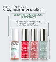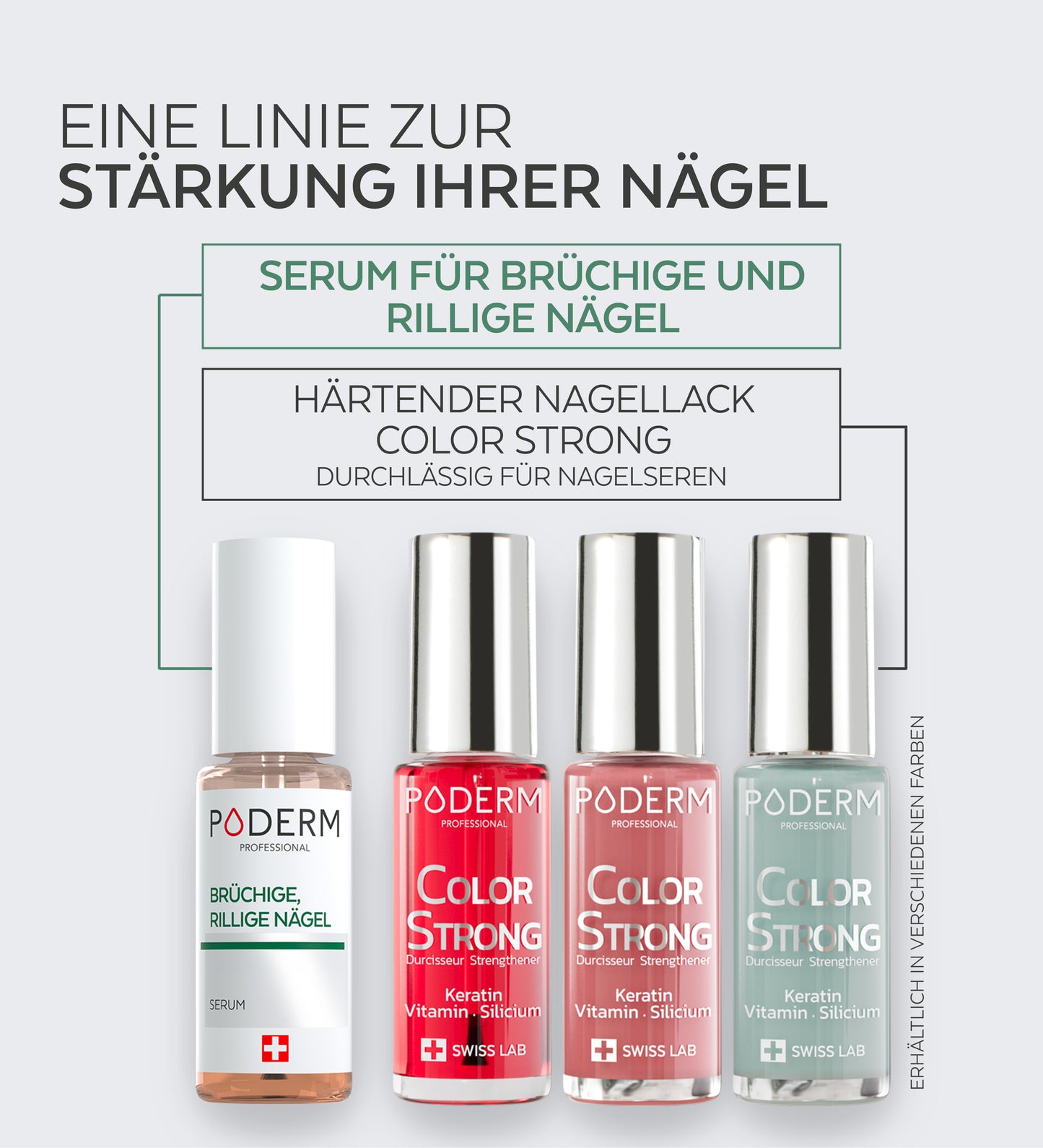 Die Nagellackserien Color Care und Color Strong sind für PODERM® Nagelseren durchlässig, so dass Sie Ihre Pflege fortsetzen können. Beide Produktreihen sind mit Biotin und Silizium angereichert, um ein gesundes und starkes Nachwachsen der Nägel zu fördern.