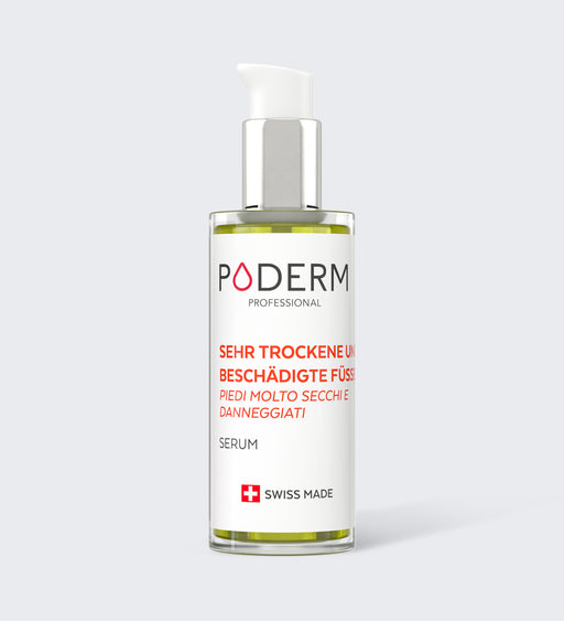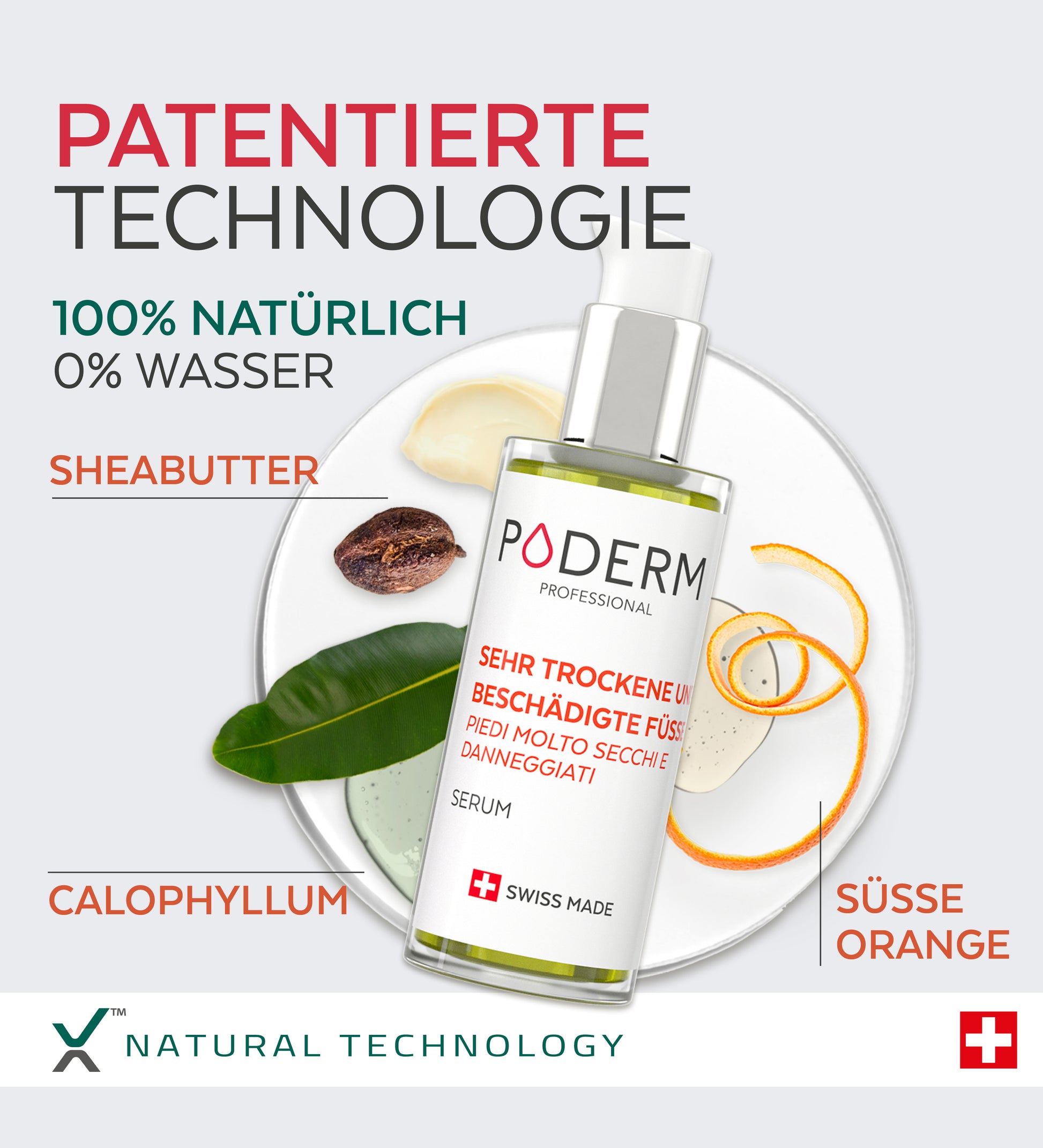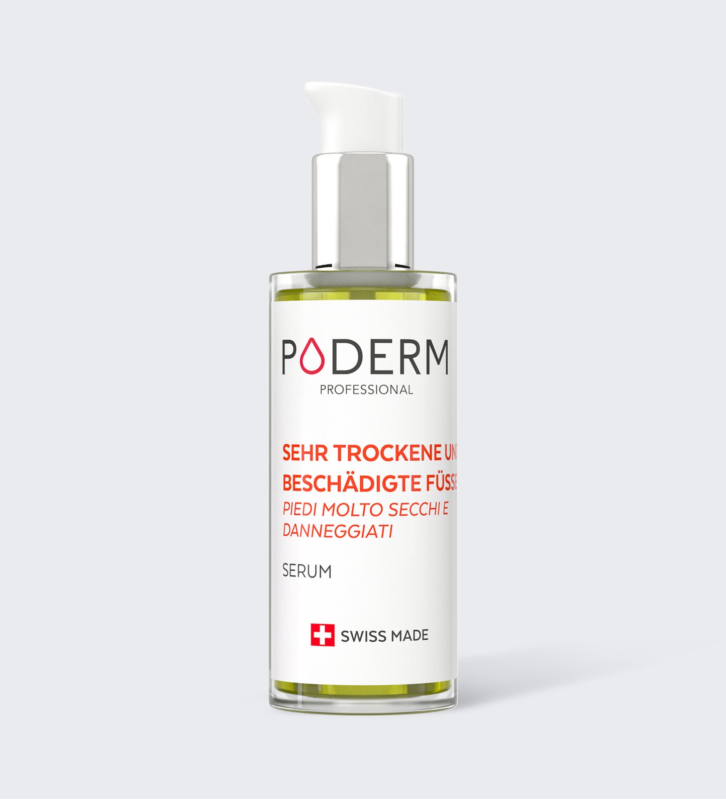 Die meisten Produkte für trockene Füße auf dem Markt sind Cremes oder Balsame auf Wasserbasis mit einem hohen Wasseranteil in ihrer Zusammensetzung. Die Fußseren von Poderm hingegen sind zu 100 % auf Wirkstoffe konzentriert und enthalten 0 % Wasser, was zur Vorbeugung von Hautkrankheiten beiträgt. Ihre ölige Textur sorgt für ein sanftes Auftragen und eine schnelle Aufnahme in die Haut, wodurch eine maximale Wirksamkeit gewährleistet wird. Dank ihrer ultrakonzentrierten Formel reicht außerdem eine kleine Menge des Serums aus, um eine große Fläche abzudecken.