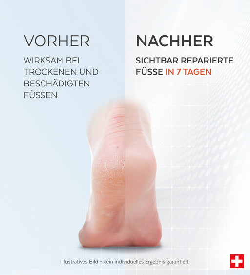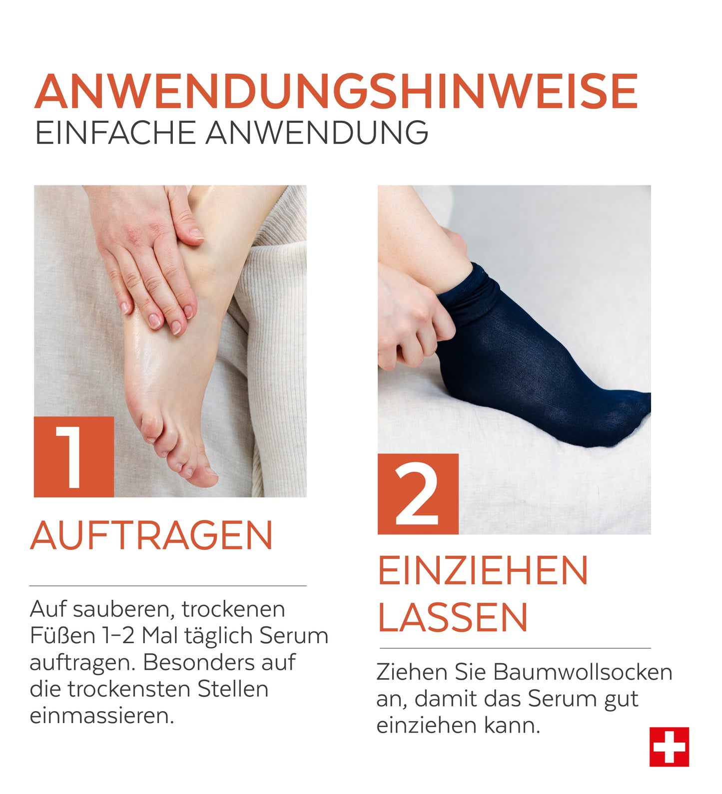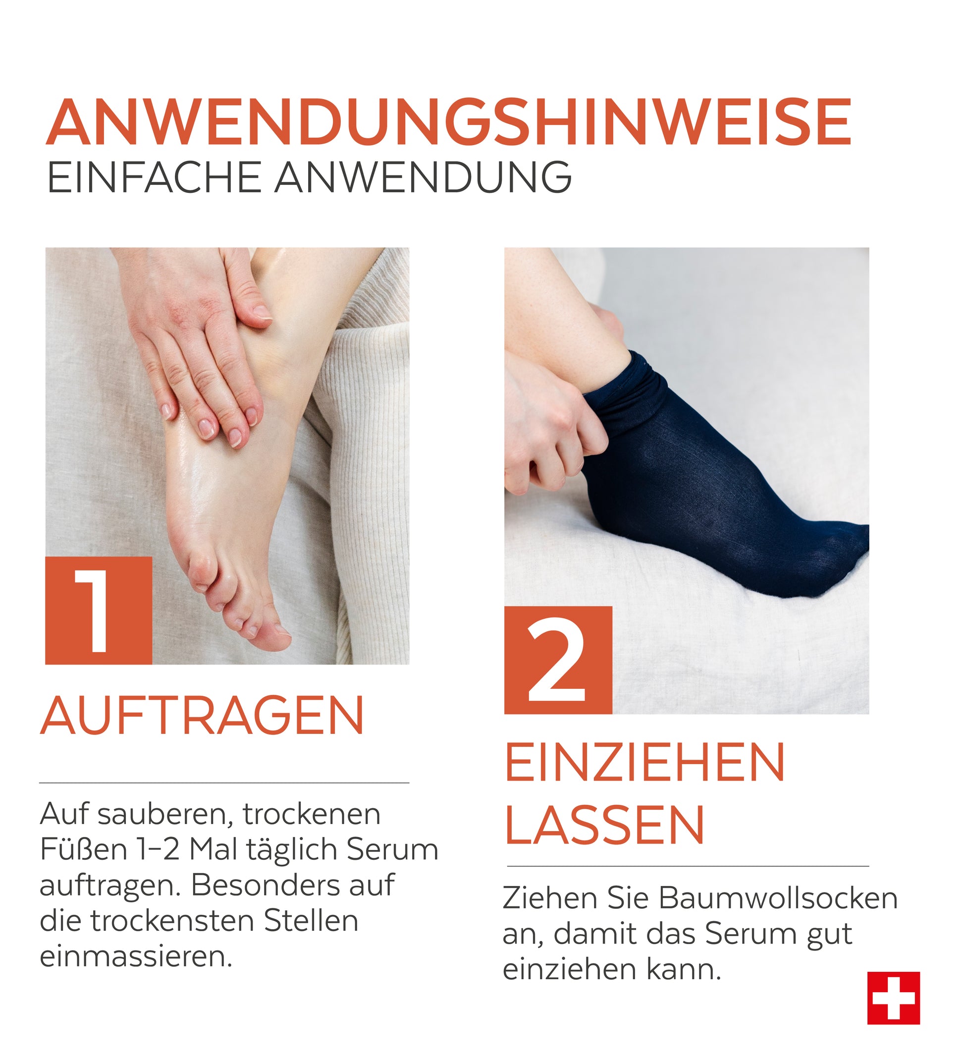 Tragen Sie das Serum ein- bis zweimal täglich auf saubere und trockene Füße auf. Massieren Sie es sanft ein und konzentrieren Sie sich dabei auf die trockensten und geschädigten Stellen.