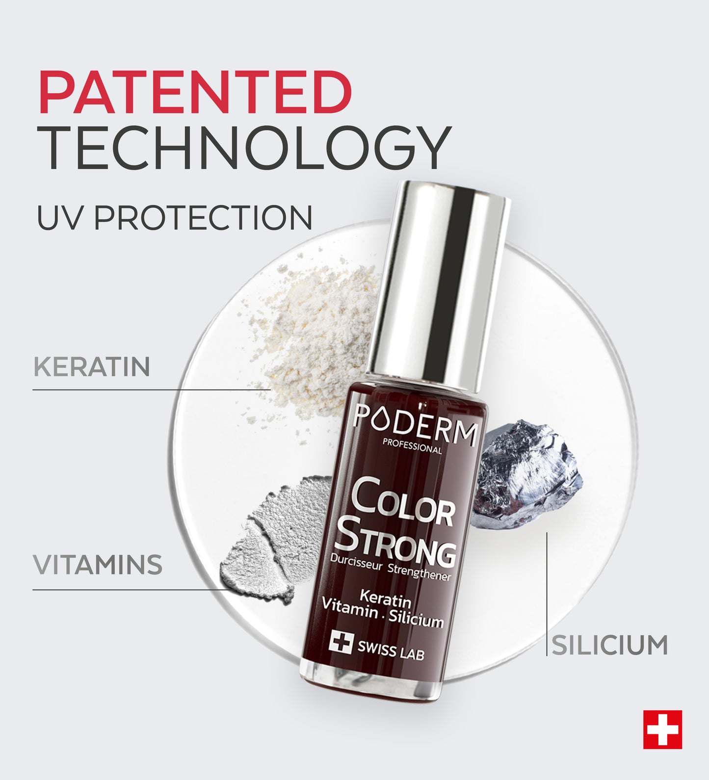 The Color Strong range of fortifying nail polishes is made up of 8 luminous colours for every occasion, plus a base coat and a top coat for a complete manicure. Color Strong nail polishes are easy to remove thanks to PODERM® Extra Gentle Remover , which removes nail polish while leaving nails shiny and nourished thanks to its acetone-free formula.