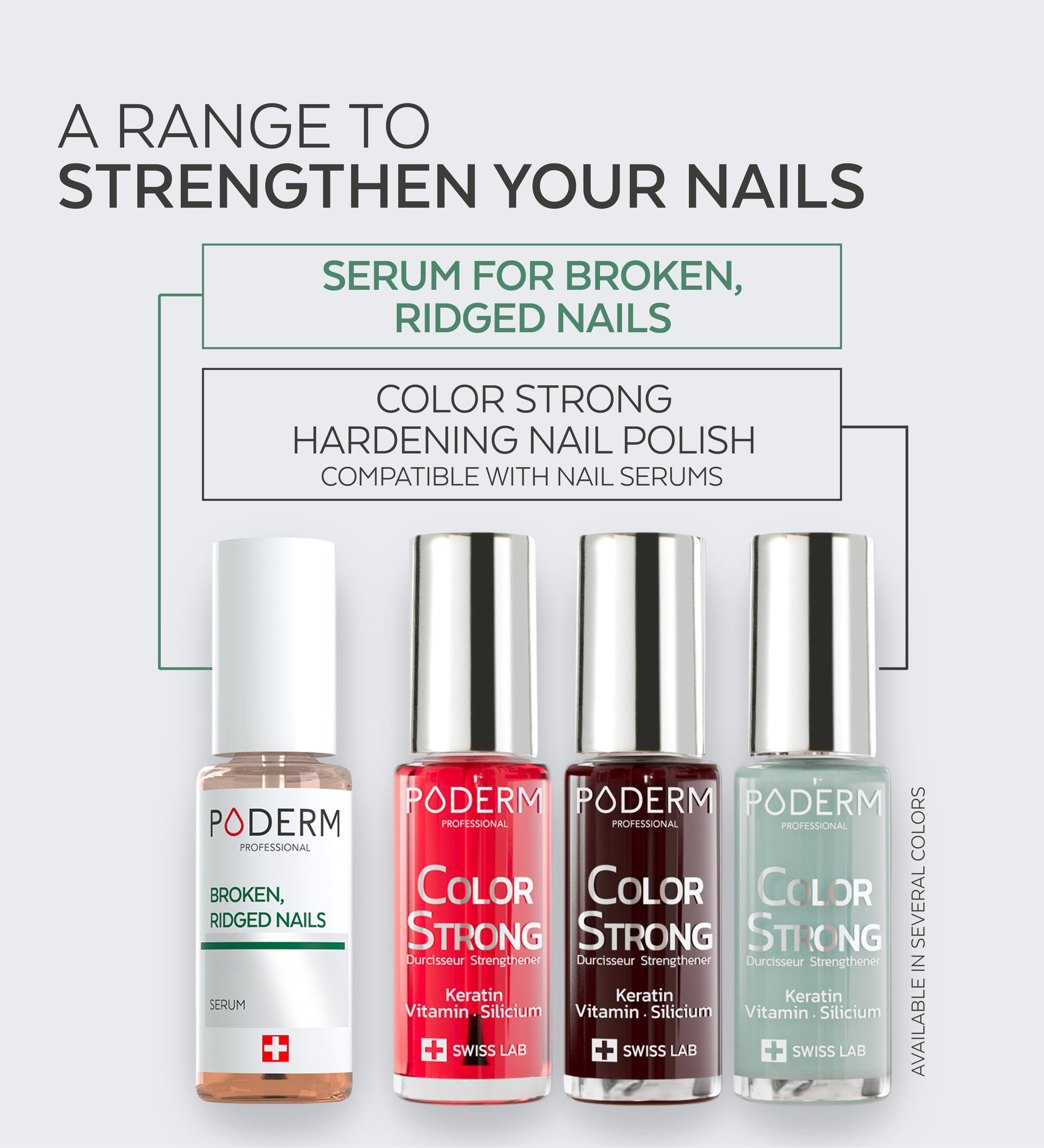 The Color Care and Color Strong nail varnish ranges are permeable to PODERM® nail serums, allowing you to continue your nail care routine. Both ranges are enriched with biotin and silicon to promote strong, healthy nail growth.