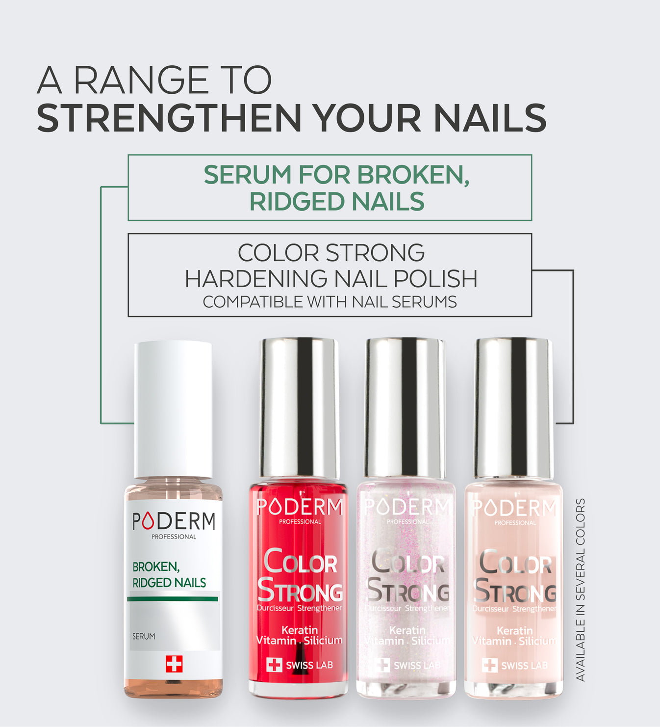 The Color Care and Color Strong nail varnish ranges are permeable to PODERM® nail serums, allowing you to continue your nail care routine. Both ranges are enriched with biotin and silicon to promote strong, healthy nail growth.