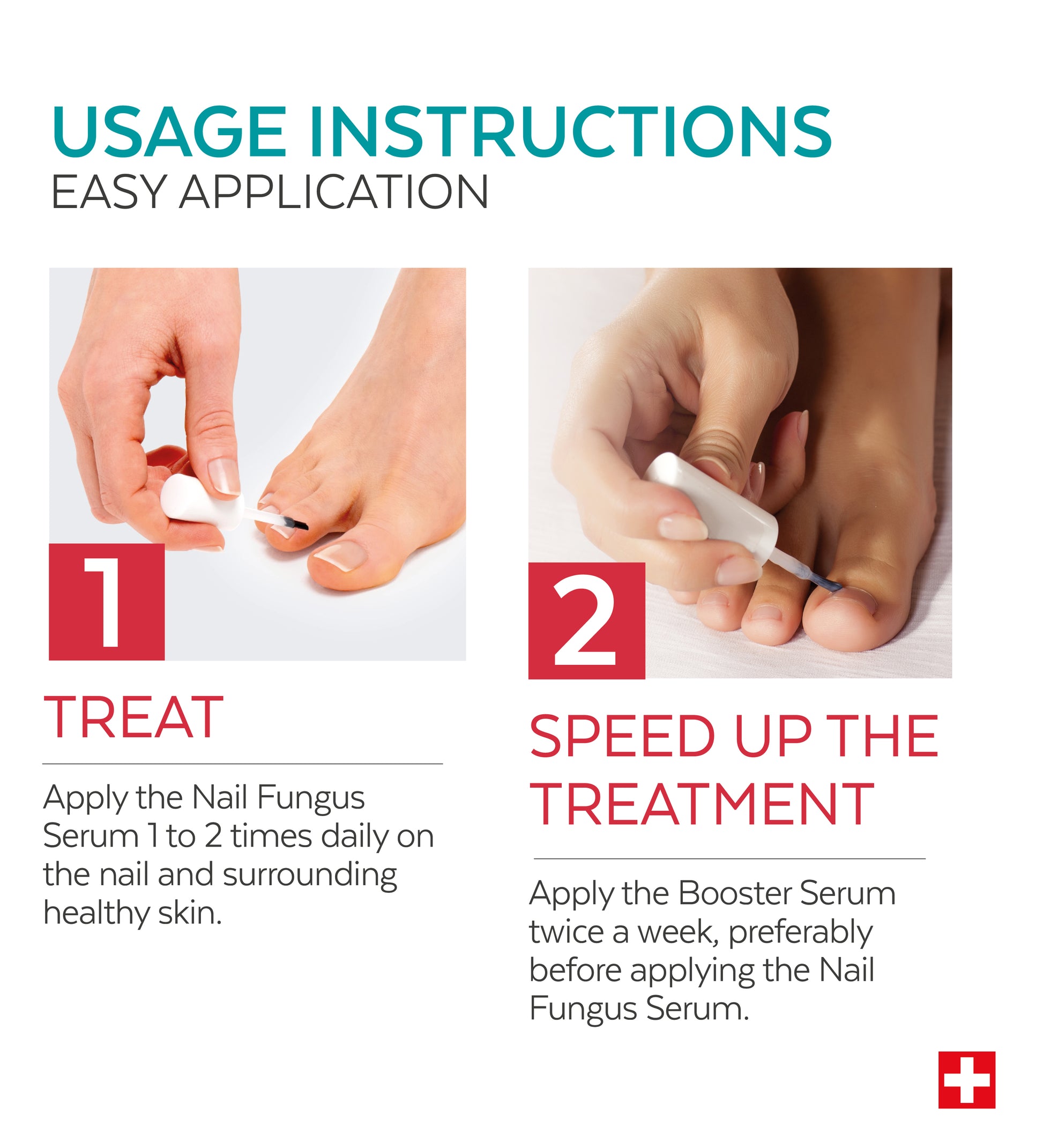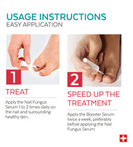 The Nail Fungus Booster Serum should be used twice a week, applying it to the nail and surrounding area before applying the Nail Fungus Serum. It should only be used in conjunction with the Nail Fungus Treatment Serum to intensify and accelerate the elimination of the fungus and restore healthy nails.