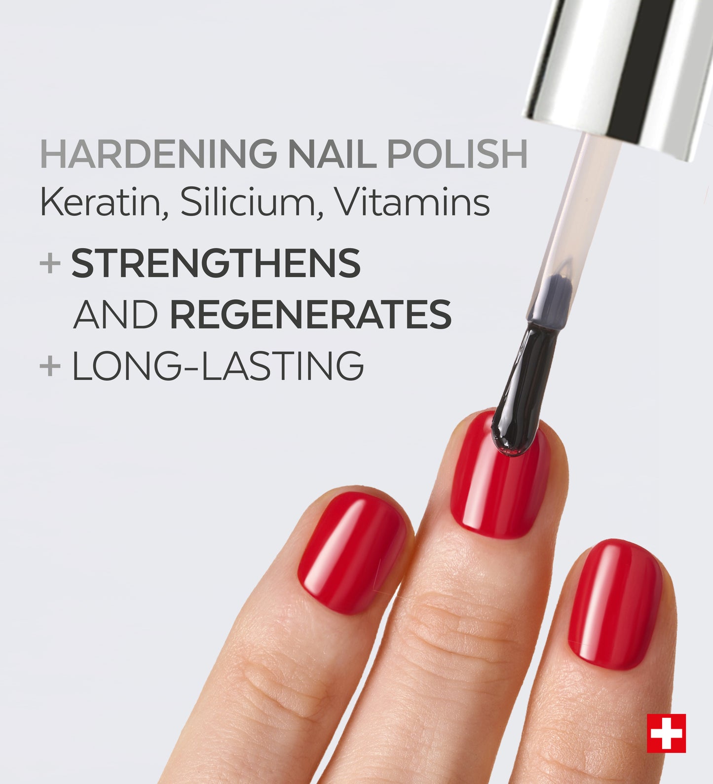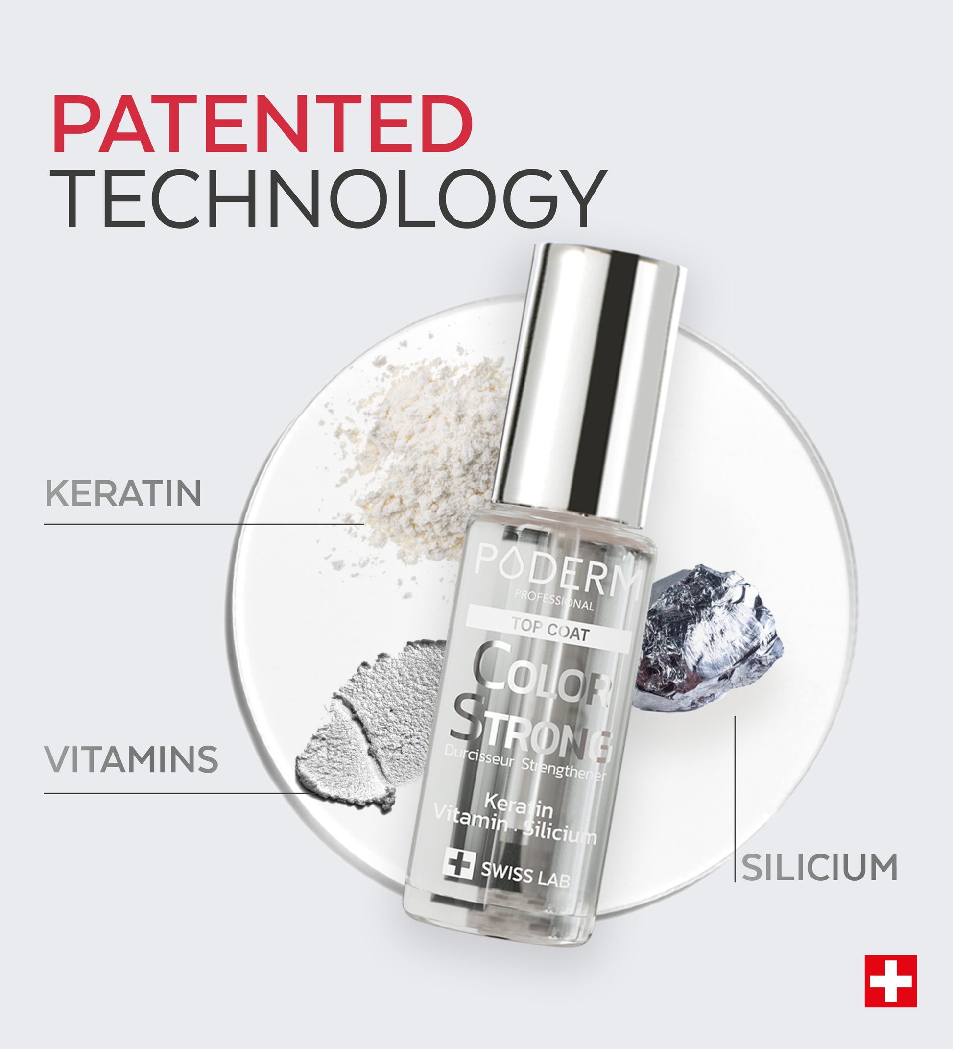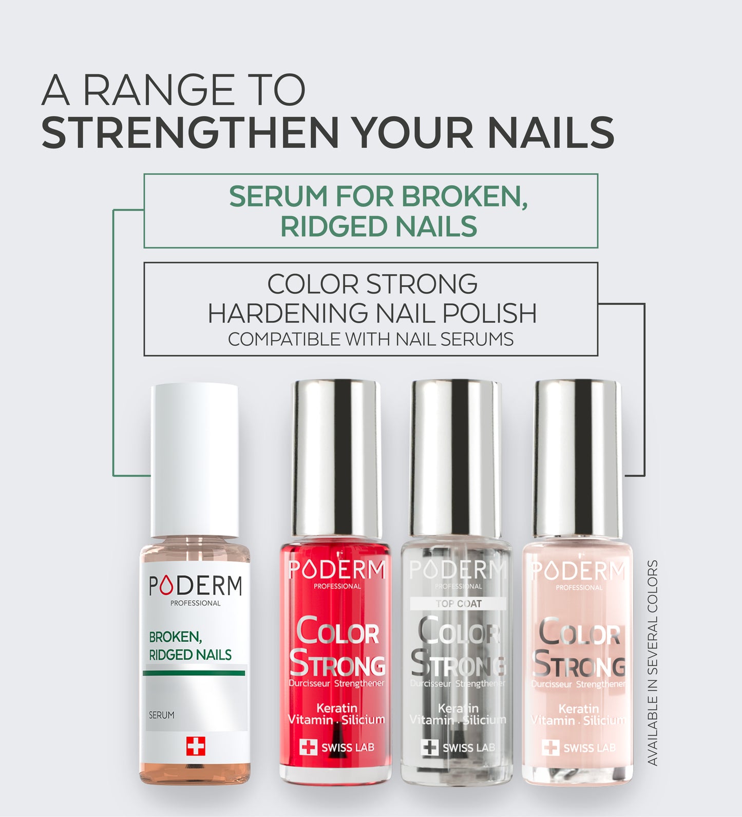 The Color Strong range of fortifying nail varnishes is made up of 8 luminous colours for every occasion, plus a base coat and a top coat for a complete manicure. Color Strong nail polishes are easy to remove thanks to PODERM® Extra Gentle Remover , which removes nail polish while leaving nails shiny and nourished thanks to its acetone-free formula.