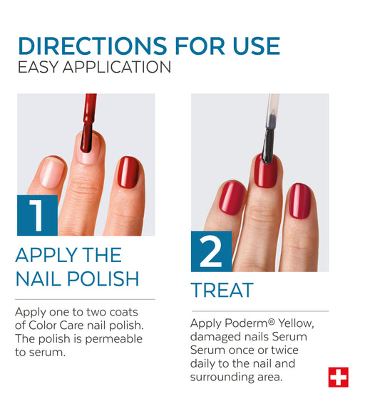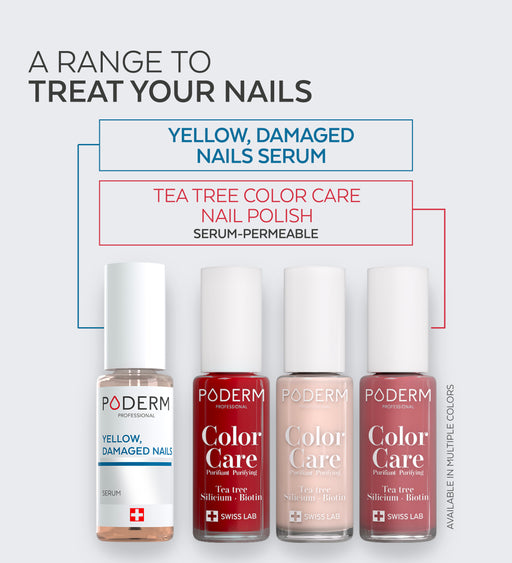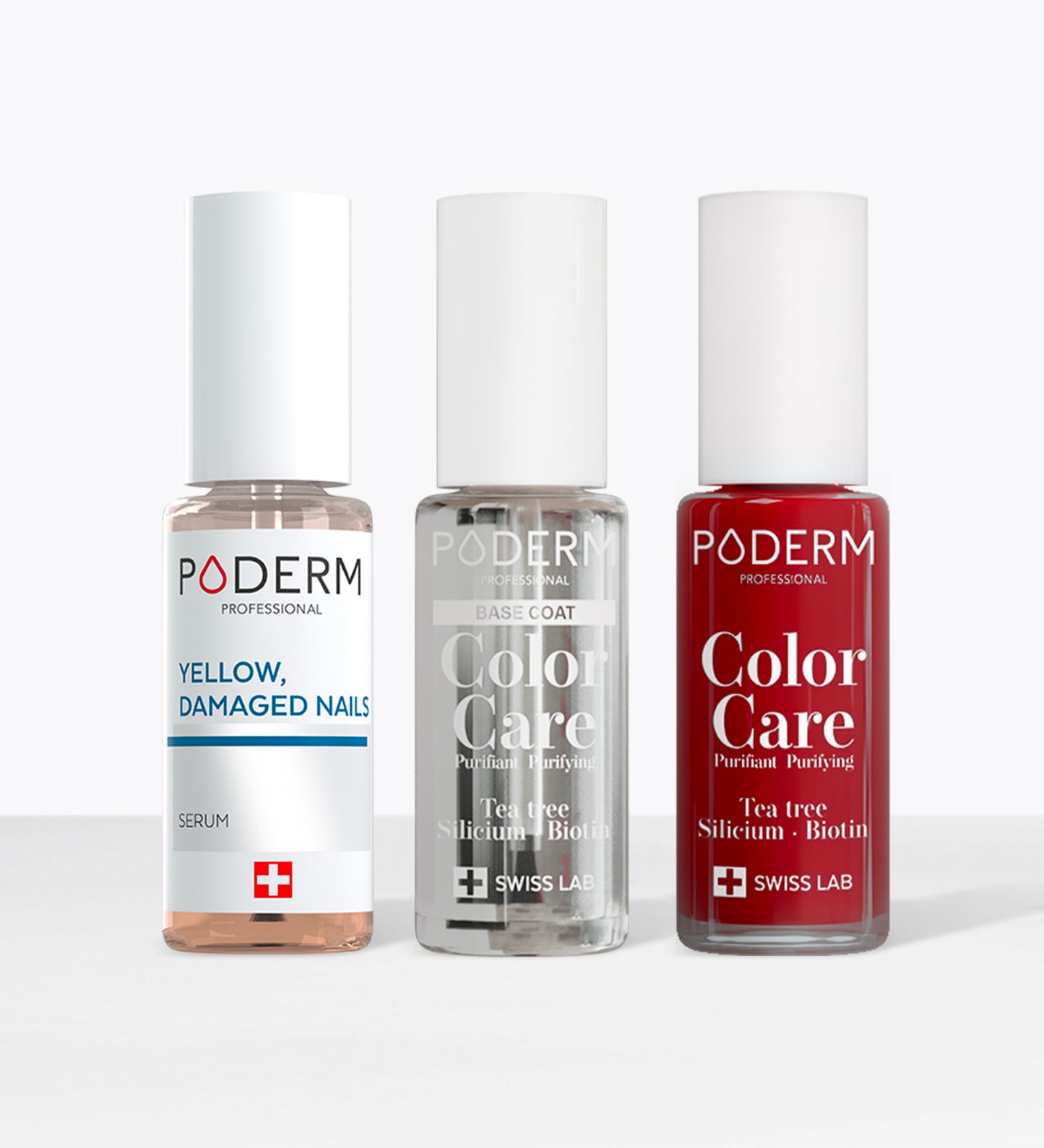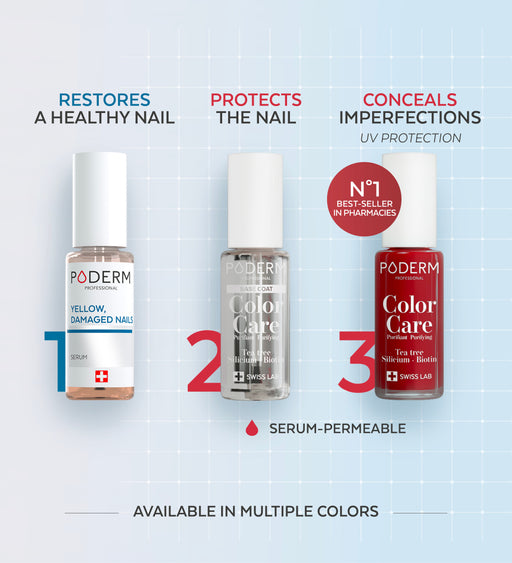 The Yellow & Damaged Nails Trio – Color Care offers a comprehensive approach: the serum targets visible signs of yellowed and damaged nails, the base coat protects, and the nail polish conceals imperfections while releasing active ingredients specifically for yellow and damaged nails, helping to restore healthy, smooth, and clear nails.