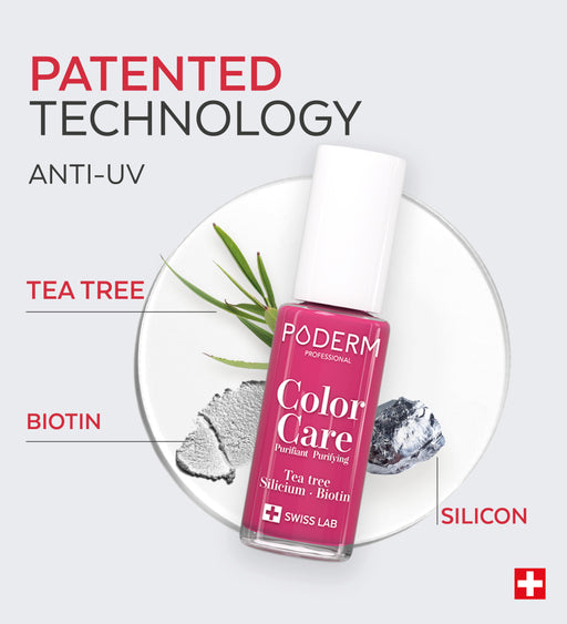 Color Care nail lacquers purify damaged nails, clarify yellow nails and promote healthy regrowth. PODERM® Color Care Nail Lacquers are breathable and allow PODERM® Nail Serums to penetrate the nail even after application.