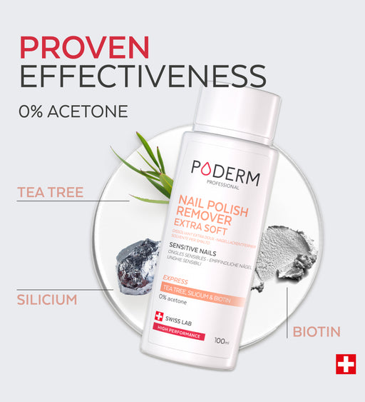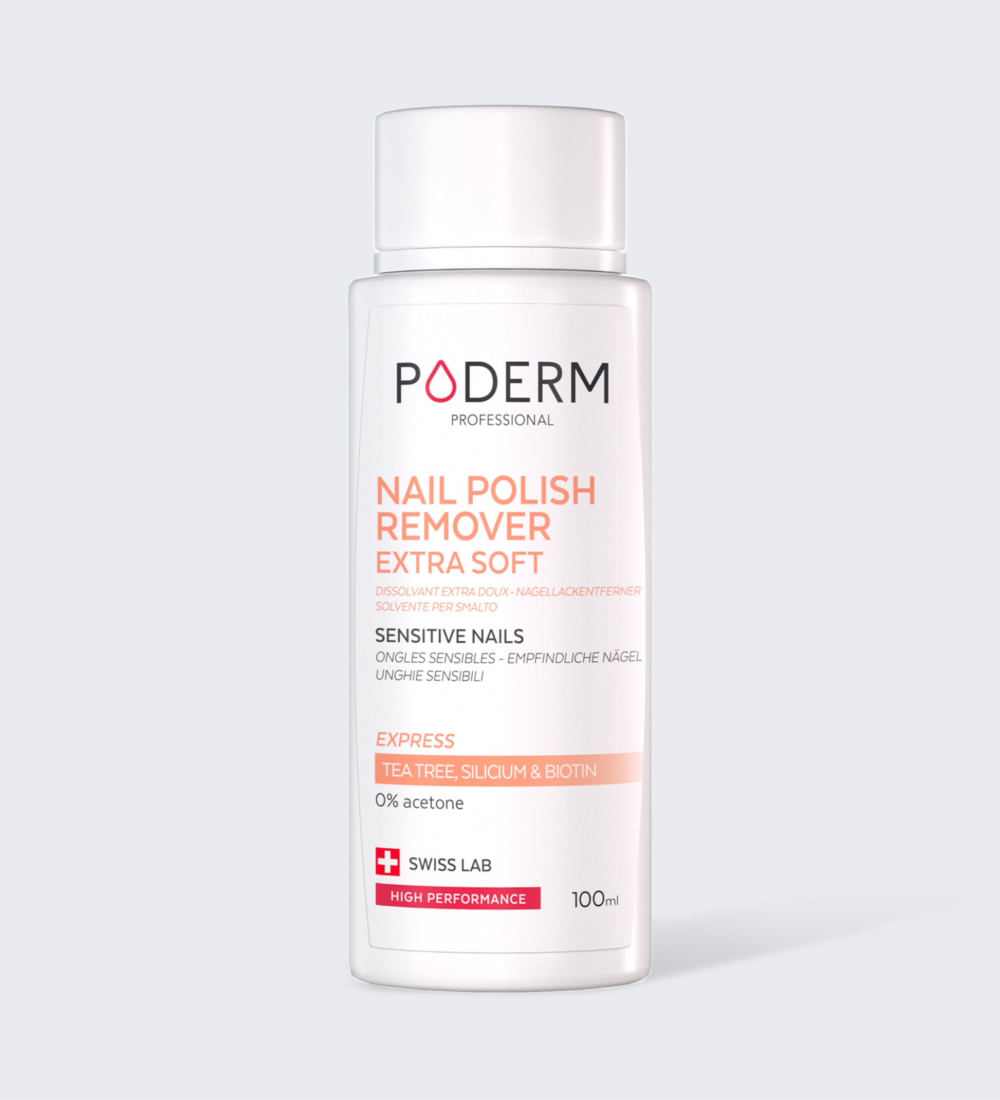 PODERM® Extra Gentle Nail Polish Remover is a nail polish remover specially formulated for sensitive nails, without acetone. Enriched with Tea Tree, Silicium and Biotin, it provides fast, effective nail polish removal while nourishing and strengthening sensitive nails weakened by nail polish application.