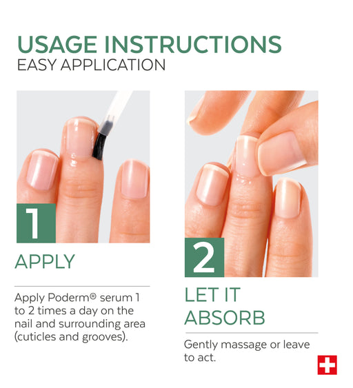 Apply PODERM® Serum 1 or 2 times a day to the nail and its contour (cuticles and grooves).