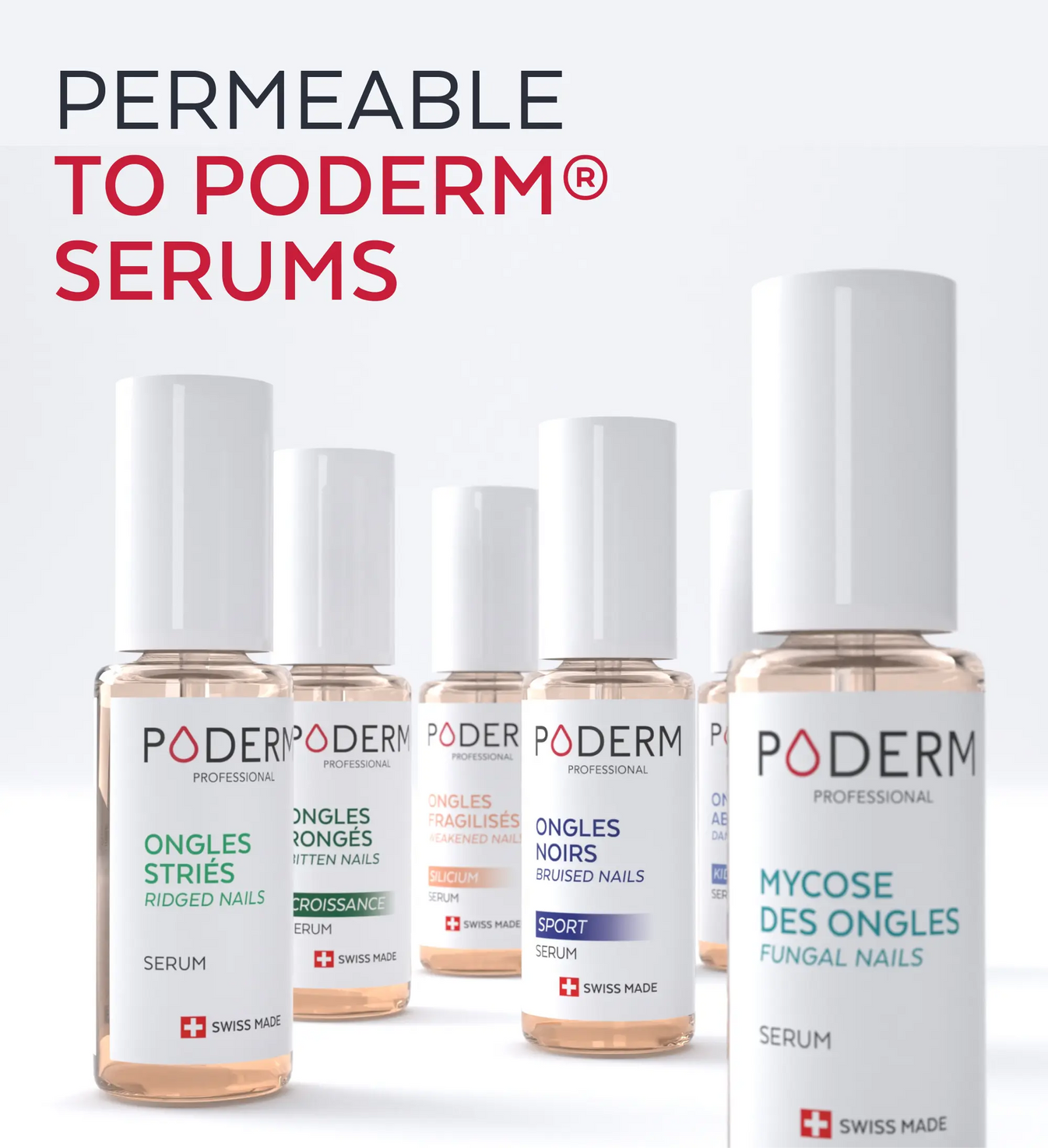 The Color Care and Color Strong nail varnish ranges are permeable to PODERM® nail serums, allowing you to continue your nail care routine. Both ranges are enriched with biotin and silicon to promote strong, healthy nail growth.