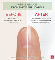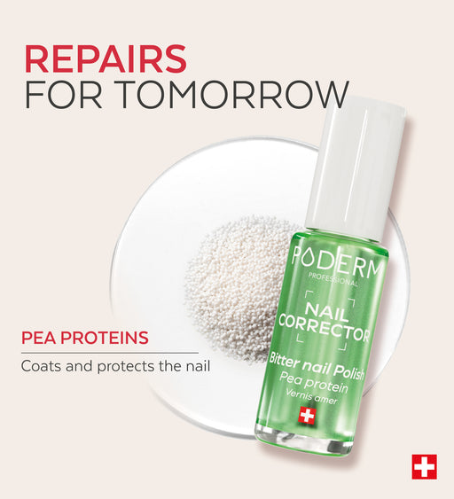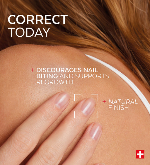 Discover the Nail Corrector Bitter Nail Polish with Pea Protein PODERM®, a treatment nail polish designed for bitten nails to help reduce nail biting frequency from the very first application. Its bitter taste discourages nail biting and helps curb the urge, supporting daily habit change.