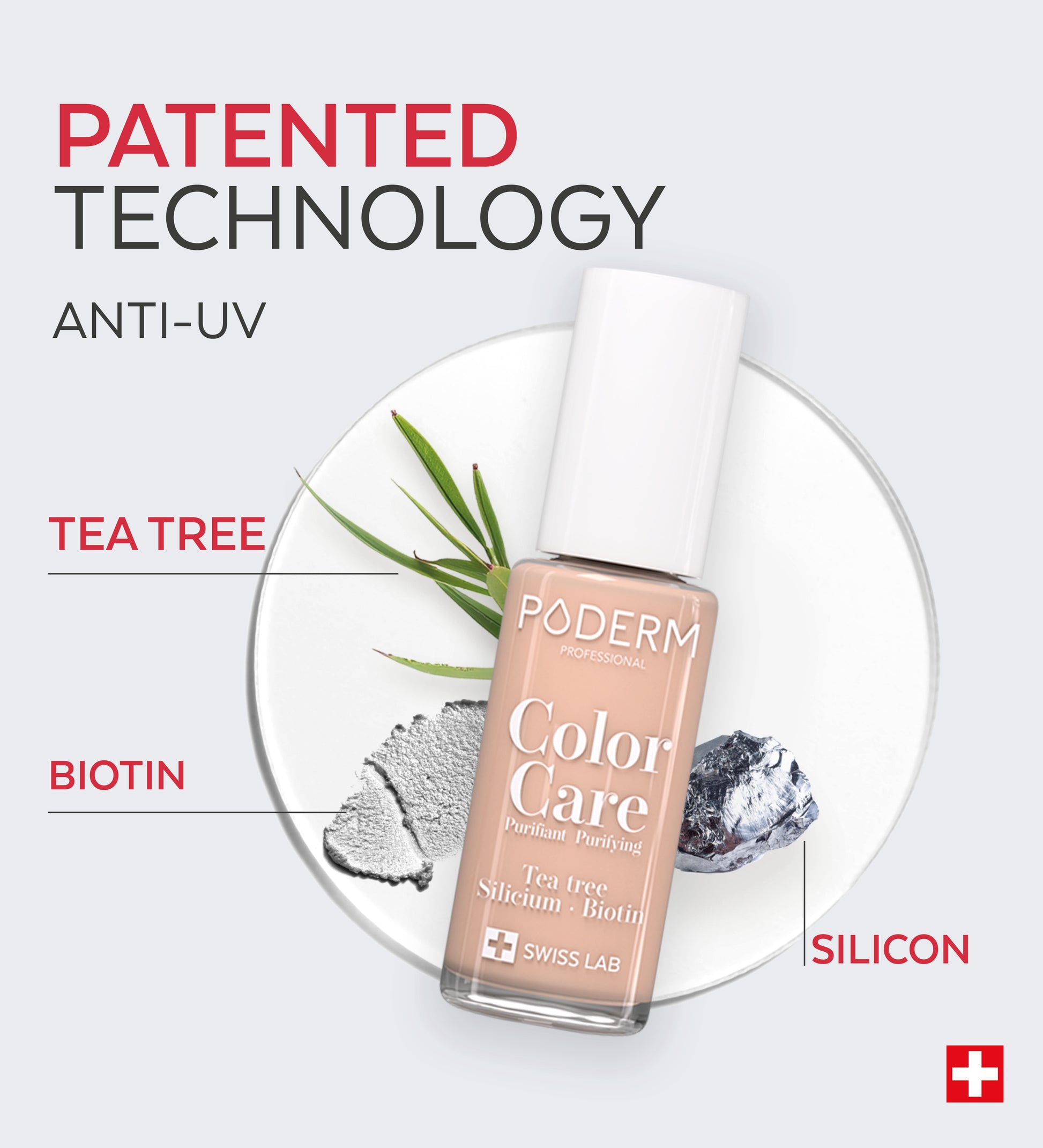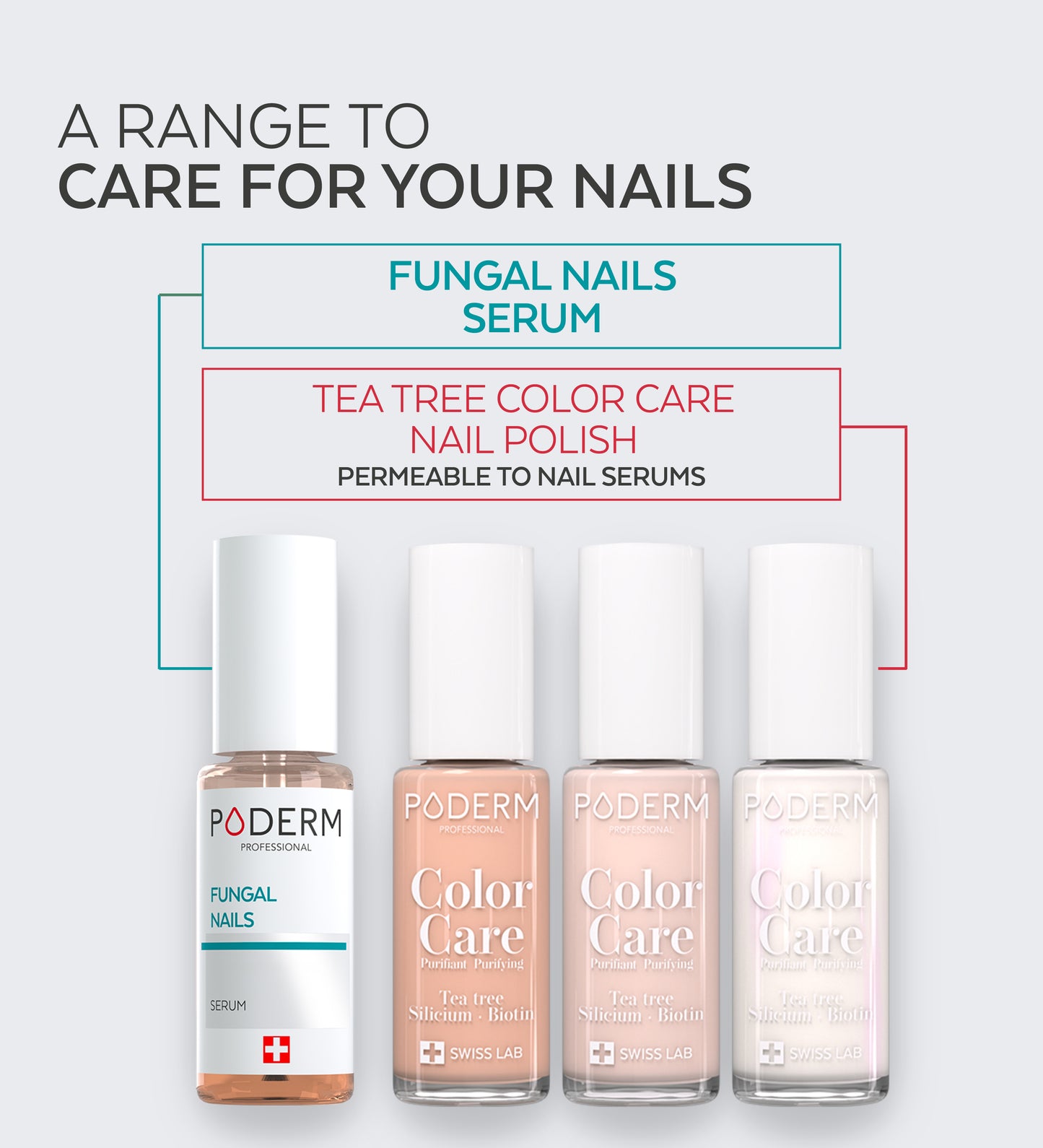 Color Care nail polishes purify damaged nails, clarify yellow nails and promote healthy nail growth. PODERM® Color Care Nail Lacquers are breathable and allow PODERM® Nail Serums to penetrate the nail even after application.