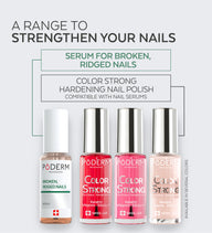 The Color Strong range of fortifying nail varnishes is made up of 8 luminous colours for every occasion, plus a base coat and a top coat for a complete manicure. Color Strong nail polishes are easy to remove thanks to PODERM® Extra Gentle Remover , which removes nail polish while leaving nails shiny and nourished thanks to its acetone-free formula.