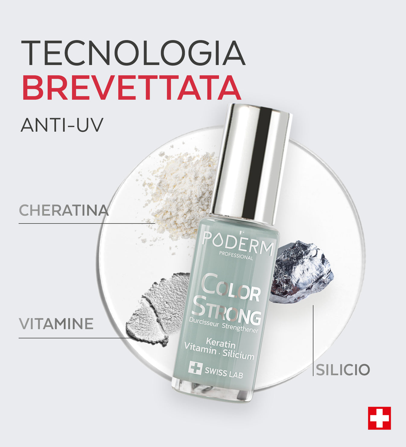 The Color Strong range of fortifying nail varnishes is made up of 12 luminous colours for every occasion, plus a base coat and a top coat for a complete manicure. Color Strong nail polishes are easy to remove thanks to PODERM® Extra Gentle Remover, which removes nail polish while leaving nails shiny and nourished thanks to its acetone-free formula.