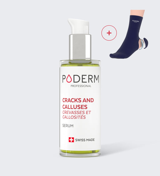PODERM® Cracks and Calluses treatment works to repair cracks in 7 days and encourage tissue regeneration. It consists of two elements that work in synergy: 1 ultra-concentrated serum and 1 pair of gel socks.