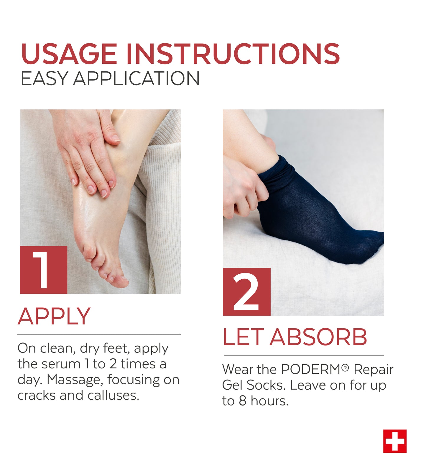 For external use. Apply a sufficient quantity of the serum to the feet, once a day in the evening at bedtime, paying particular attention to cracks and calluses, then put on the PODERM® Repair Gel Socks. Leave on for up to 8 hours. Precautions for use: Do not walk or stand with PODERM® Repair Gel Socks on, as there is a risk of falling and premature wear. Socks can be reused and washed in warm water and soap. Keep away from heat. Keep out of reach of children. Do not use if you are allergic to any of the ingredients. Do not apply to damaged skin. For topical use only. Do not ingest. Avoid contact with eyes; if contact occurs, rinse immediately with water. 12 years and over - not for use by children, pregnant or breast-feeding women.