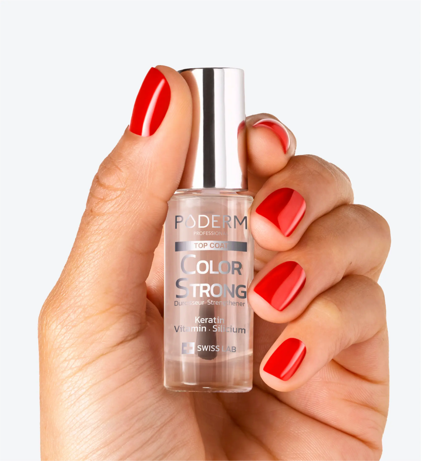 The Color Strong range of fortifying nail varnishes is made up of 8 luminous colours for every occasion, plus a base coat and a top coat for a complete manicure. Color Strong nail polishes are easy to remove thanks to PODERM® Extra Gentle Remover , which removes nail polish while leaving nails shiny and nourished thanks to its acetone-free formula.