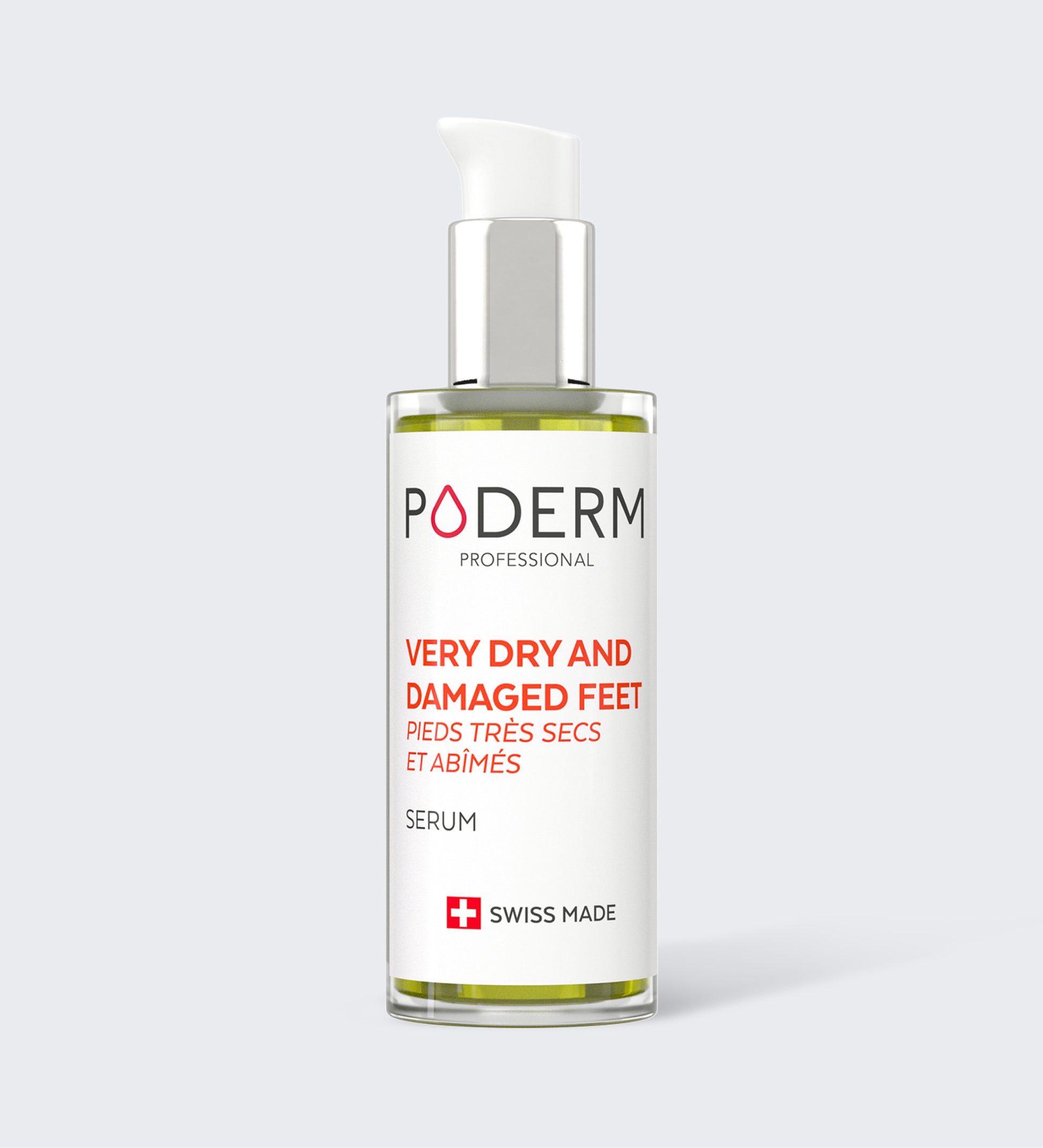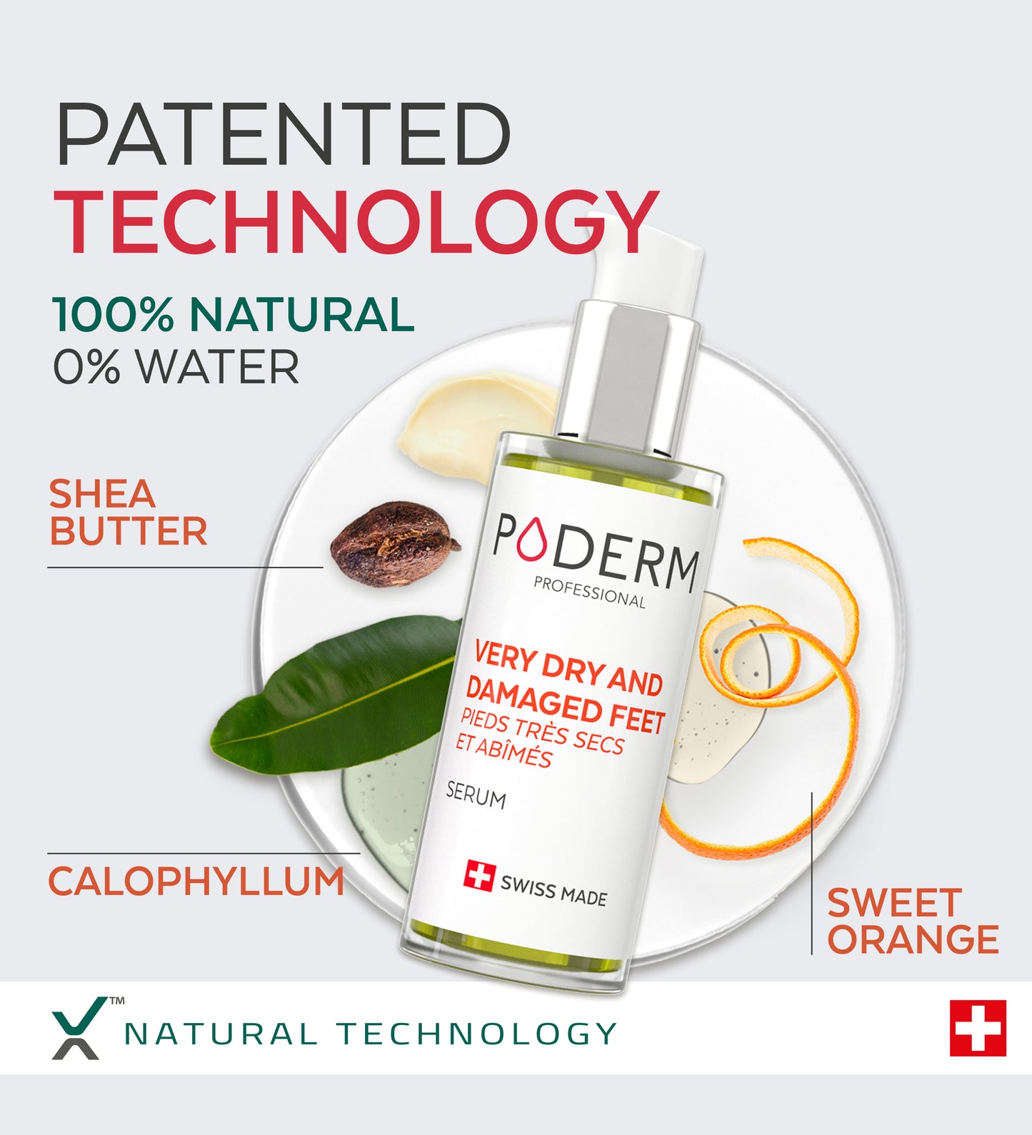 Most dry foot products on the market are water-based creams or balms, with a high proportion of water in their composition. Poderm foot serums, on the other hand, are 100% concentrated in active ingredients and contain 0% water, which helps prevent skin disorders. Their oily texture ensures gentle application and rapid absorption into the skin, guaranteeing maximum effectiveness. What's more, thanks to their ultra-concentrated formula, a small amount of serum is enough to cover a large surface area.