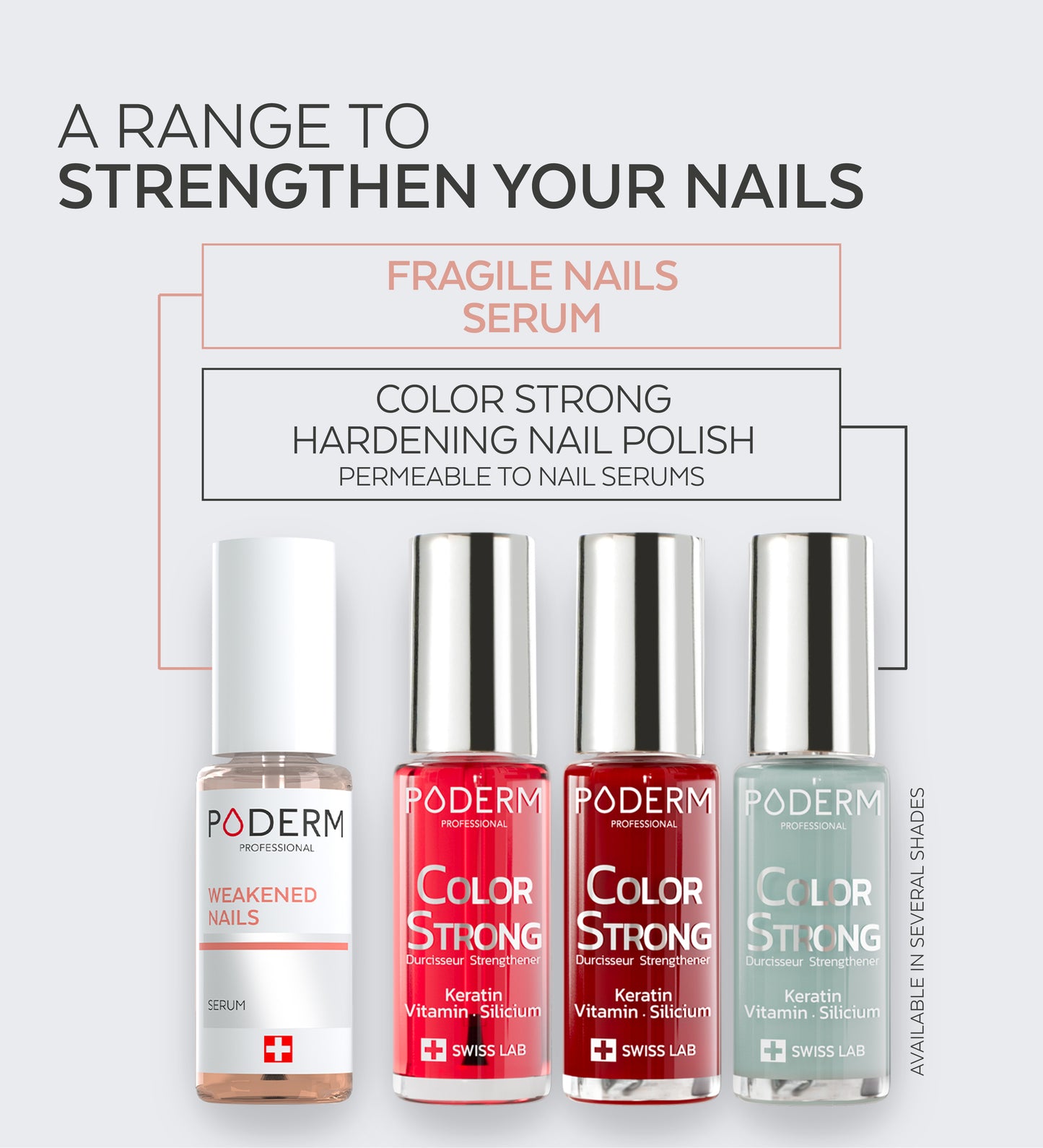 Enriched with silicium, vitamin B12 and castor oil, this serum strengthens, protects and repairs damaged nails and fragile skin. It can be used in conjunction with Color Strong PODERM® nail polish hardeners, which are permeable to the serum, making it possible to beautify nails while treating them.