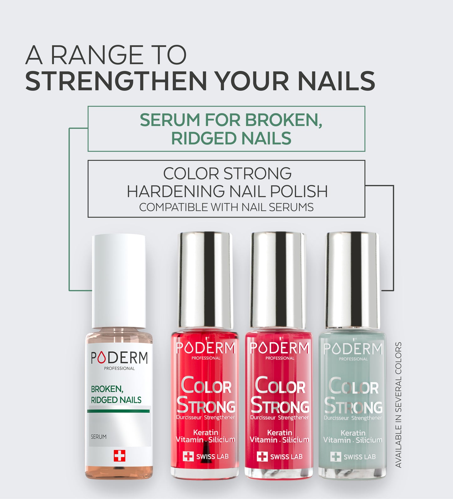 The Color Care and Color Strong nail varnish ranges are permeable to PODERM® nail serums, allowing you to continue your nail care routine. Both ranges are enriched with biotin and silicon to promote strong, healthy nail growth.