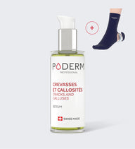 Le soin Crevasses et Callosités PODERM® agit pour réparer les crevasses en 7 jours et favoriser la régénération des tissus. Il se compose de deux éléments qui agissent en synergie : 1 sérum ultra-concentré et 1 paire de chaussettes en gel.