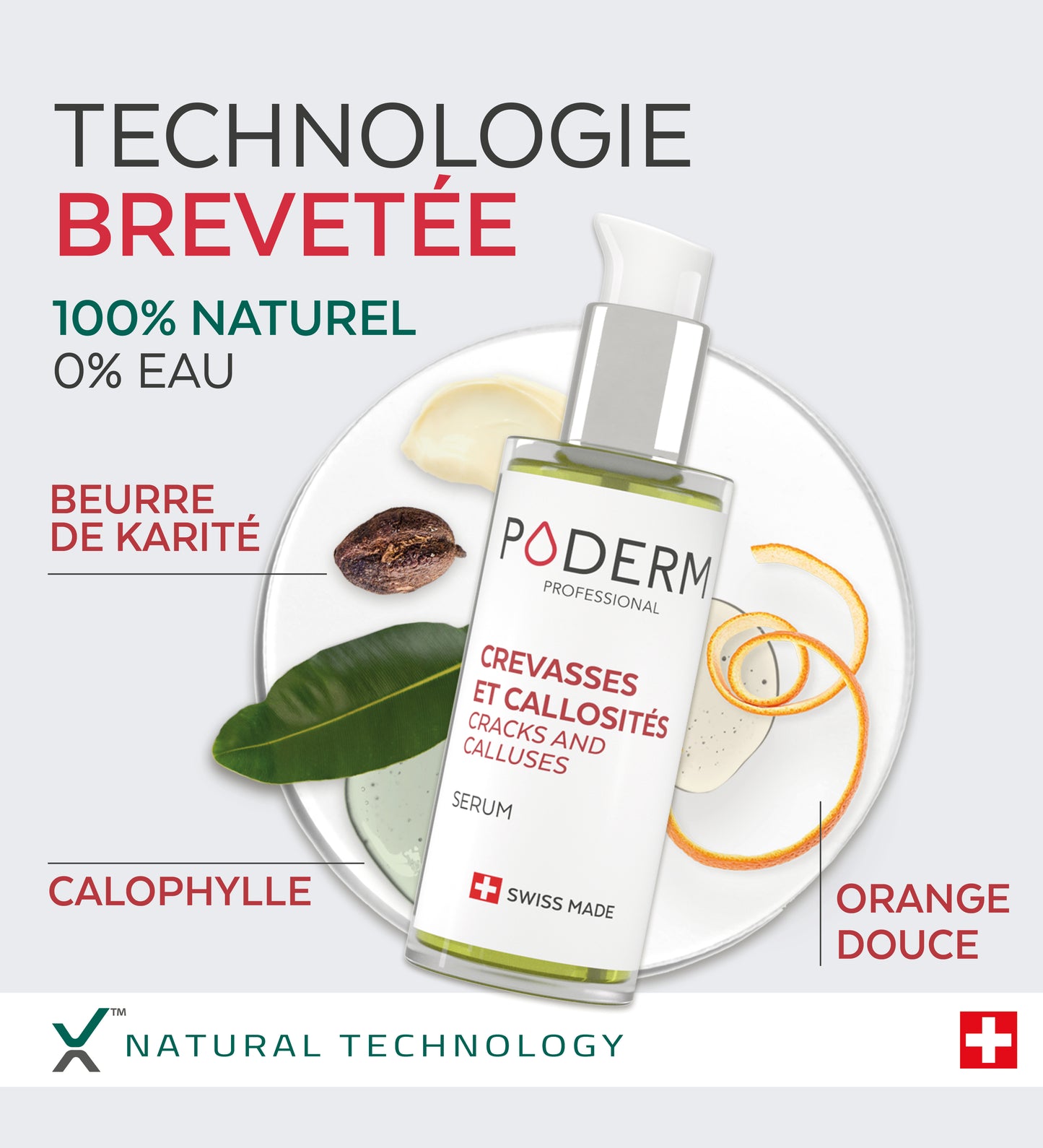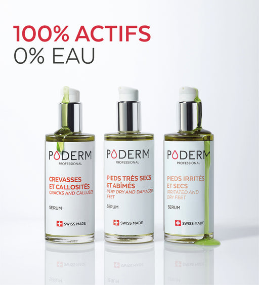 Le sérum Crevasses et Callosités fait partie de la gamme sérums pieds PODERM®, dont la formulation unique repose sur 3 piliers :