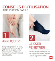 Usage externe. Appliquer le sérum en quantité suffisante sur les pieds, 1 fois par jour le soir au coucher, en insistant sur les crevasses et callosités, puis enfiler les Chaussettes en Gel Réparateur PODERM®. Laisser agir jusqu’à 8h. Précautions d’emploi : Ne pas marcher ou se tenir debout avec les chaussettes en Gel Réparateur PODERM®, risque de chute et d’usure prématurée. Chaussettes réutilisables et lavables à l’eau tiède et au savon. À conserver à l’abri de la chaleur. Tenir hors de portée des enfants. Ne pas utiliser en cas d’allergie à l’un des composants. Ne pas appliquer sur une peau lésée. Usage topique. Ne pas ingérer. Éviter le contact avec les yeux ; en cas de contact, rincer immédiatement à l’eau. À partir de 12 ans. Déconseillé chez les femmes enceintes ou allaitantes.